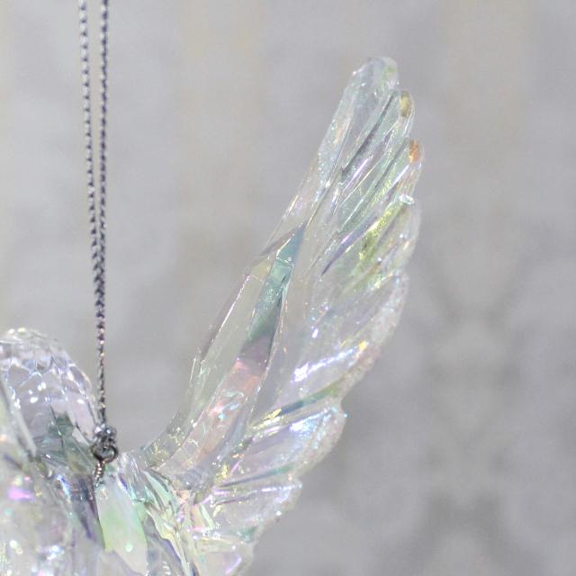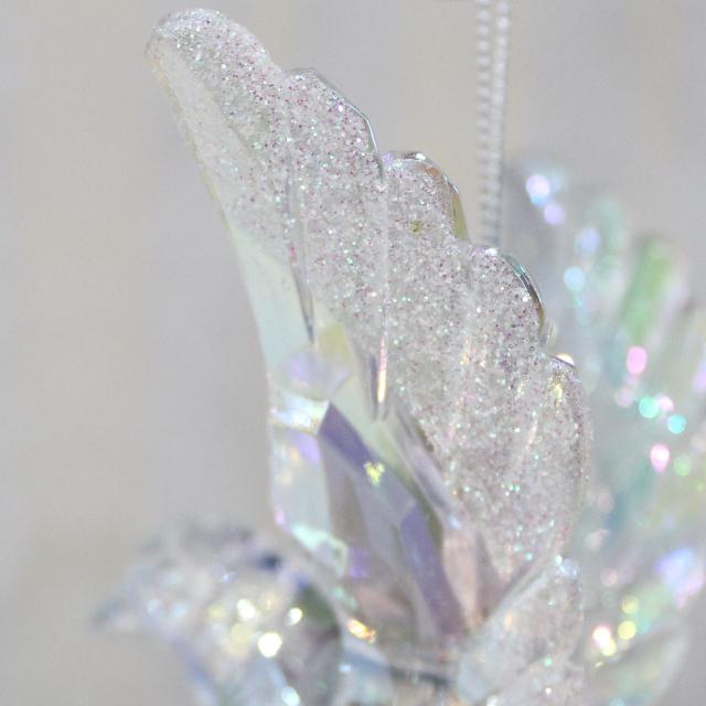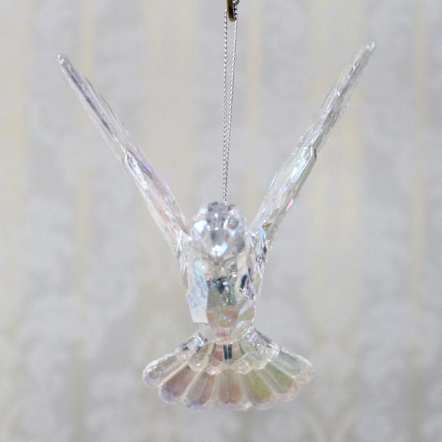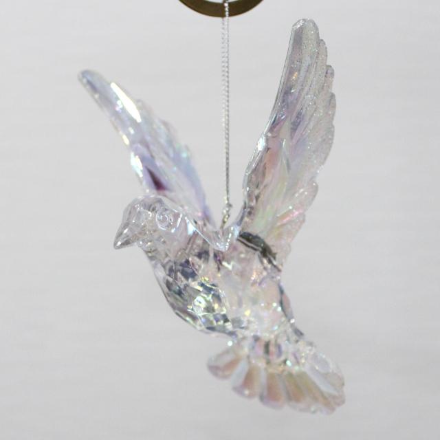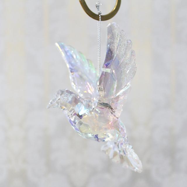 虹色に見えるロマンチックなアクリル製の鳥のクリスマスオーナメント。 |