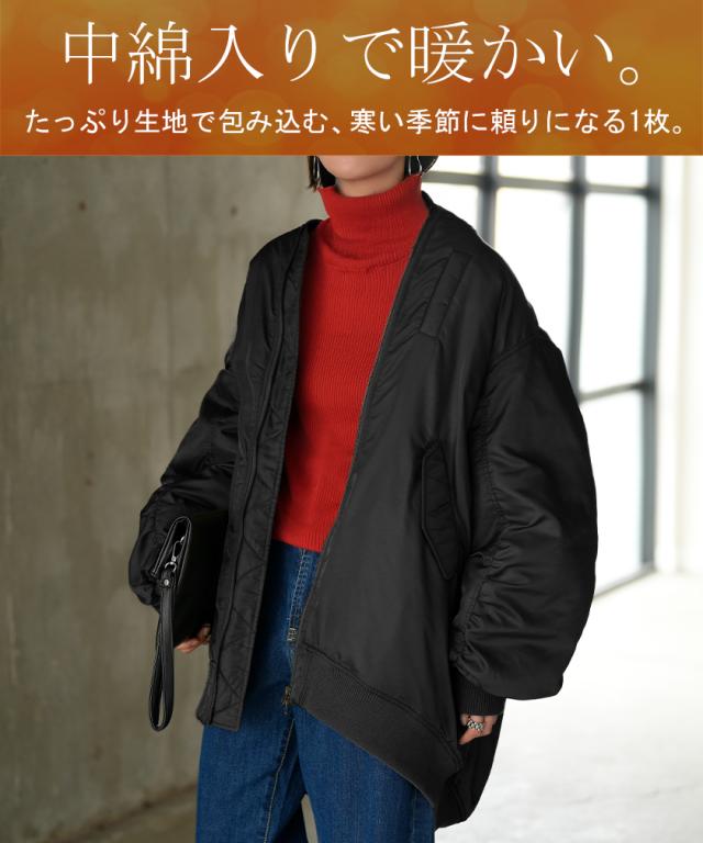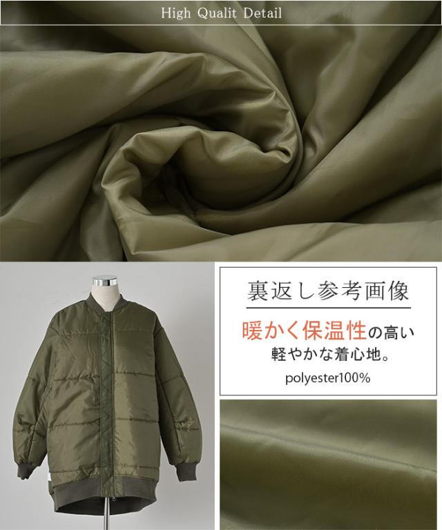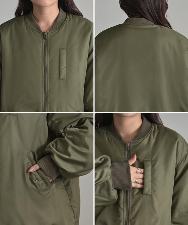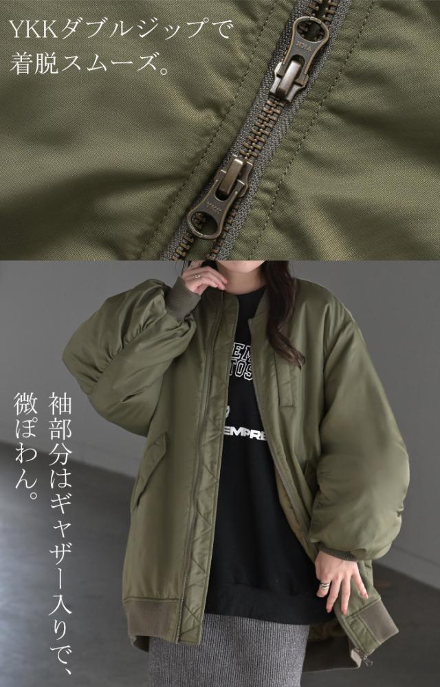 2025AW新作 ジャケット MA-1 アウター 中綿 レディース ロング ジャンパー ブルゾン コート ミリタリー 羽織 ボリュームスリーブ オーバーサイズ 大きいサイズ 軽い YKK ダブルジップ ナイロン リブ 保温 体型カバー お尻が隠れる MA1 おしゃれ 黒 カーキ 秋 冬 HUG.U