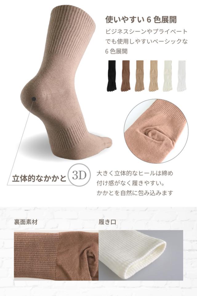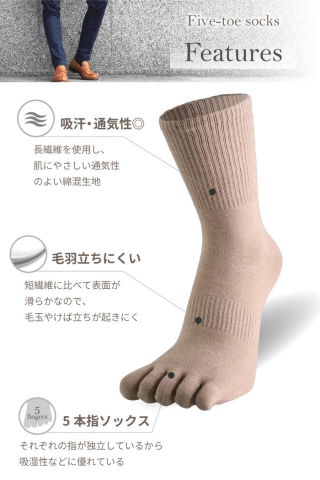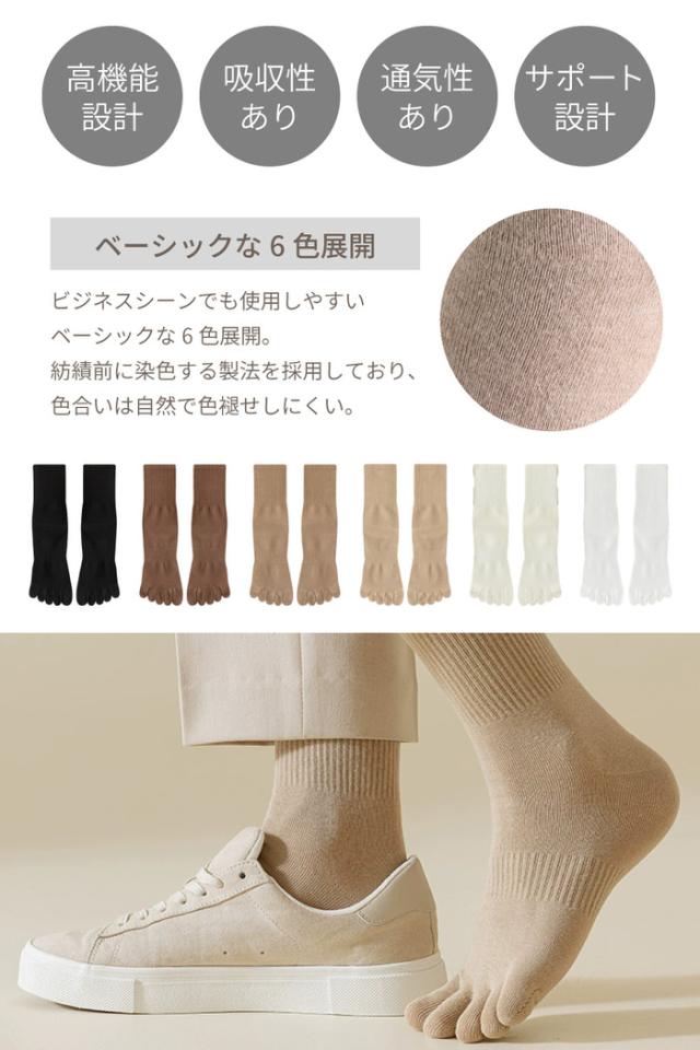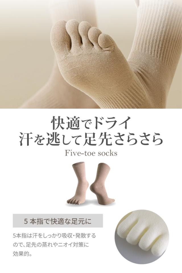 5本指は汗をしっかり吸収、発散するので足先の蒸れやニオイ対策に効果的。