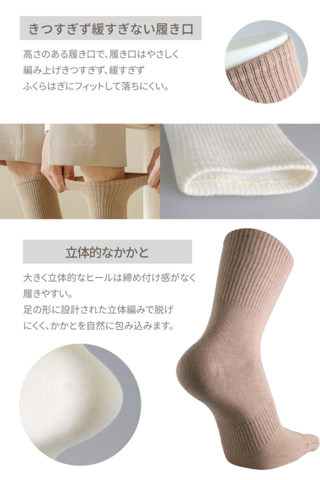 足の形に設計された立体編みで脱げにくく、かかとを自然に包み込みます。
