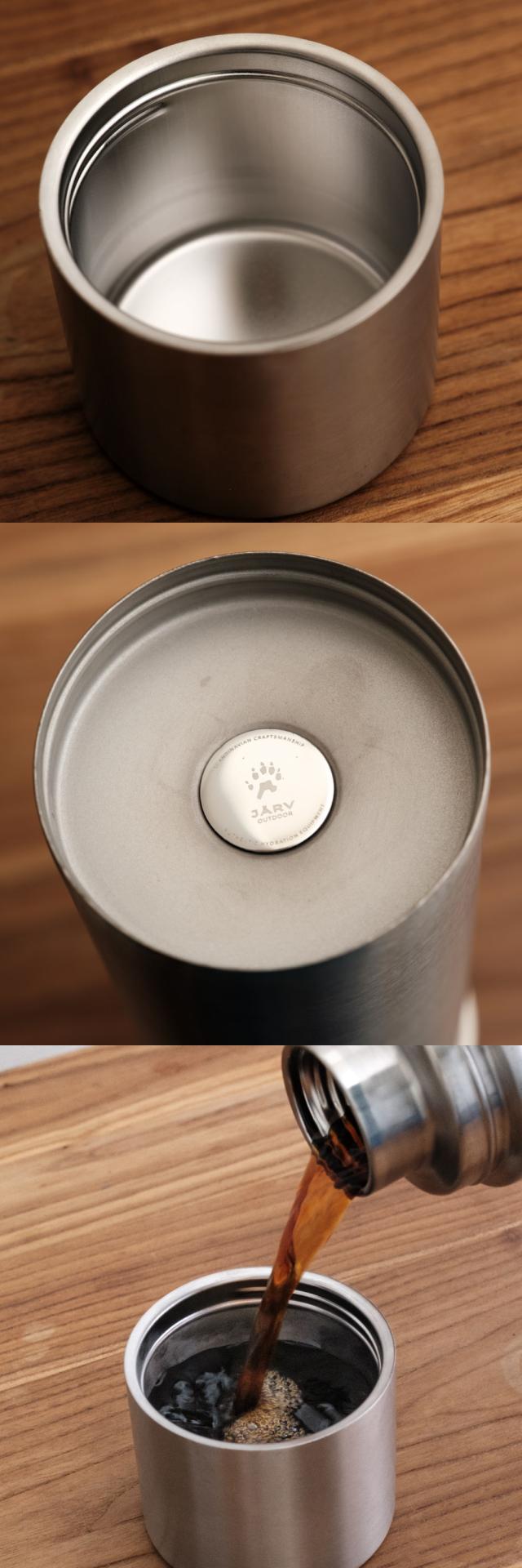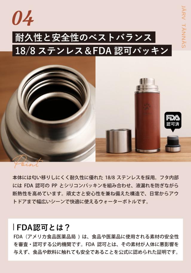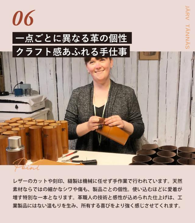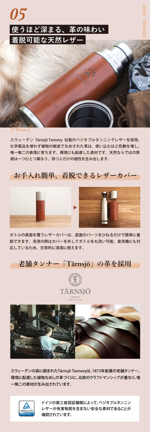 レザーとステンレスのコンビネーションが美しい、容量725mlのウォーターボトル。レザーにはスウェーデンTarnsjo Tannery社製ベジタブルタンニングレザーを使用し、グリップのカット、刻印、縫製は国内で手作業で行われています。レザーにはスウェーデン語で「ヤールヴ」を意味するクズリの足跡の刻印が入り。本体のステンレスには匂い移りがしにくく耐久性の高い高品質の18/8ステンレスを使用し、フタ内部のシリコンパッキンには断熱性に優れ液漏れを防ぐFDA認可のPPを採用しています。蓋部分を覆うように一体化できるマグカップ付きで、複数人でも飲みやすいデザインです。