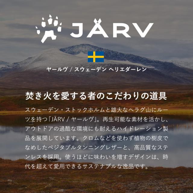 スウェーデンのストックホルムと雄大なヘラグ山の小川にルーツを持つ「J?RV / ヤールヴ」は、出来る限り再生可能な素材を使用し、アウトドアの過酷な環境下でもタフに長く活用できるウォーターボトルなどのハイドレーション製品を展開するブランドです。大自然からインスピレーションを得たプロダクトは、クロムなどの化学薬品を使用せず植物の樹皮でなめされたベジタブルタンニングレザーと、高品質なステンレス素材を採用。使い続けることで味わいを増すスマートで機能的なデザインは、時代を超えて愛用できる唯一無二のサステナブルな逸品となっています。 ※「ヤールヴ」はユーラシア大陸北部に生息するイタチ科の動物「クズリ」を意味しています。