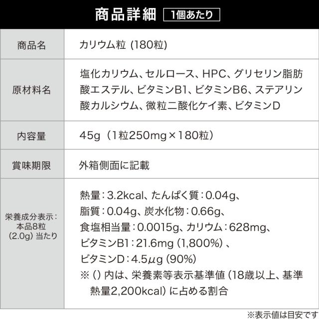 | 塩化カリウム、セルロース、HPC、グリセリン脂肪酸エステル、ビタミンB1、ビタミンB6、ステアリン酸カルシウム、微粒二酸化ケイ素、ビタミンD |