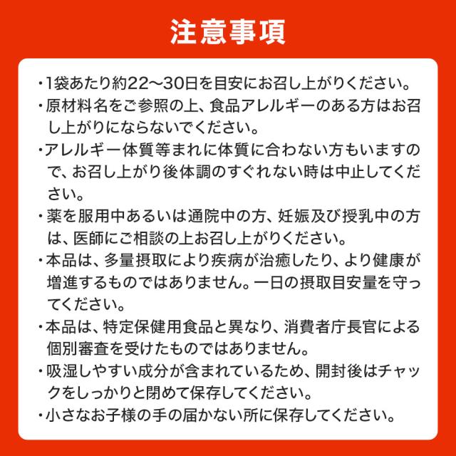 | 《保存方法》 ●吸湿しやすい成分が含まれているため、開封後はチャックをしっかりと閉めて保存してください。 ●小さなお子様の手の届かない所に保存してください。 《お召し上がり方》 ●栄養補助食品として、一日8粒を目安に2〜3回に分け、水などと共にお召し上がりください。 ●空腹時及び一度に大量のお召し上がりは、お控えください。 ●最初は少量よりお召し上がりください。 《ご利用上のお願い》 ●1袋あたり約22〜30日を目安にお召し上がりください。 ●原材料名をご参照の上、食品アレルギーのある方はお召し上がりにならないでください。 ●アレルギー体質等まれに体質に合わない方もいますので、お召し上がり後体調のすぐれない時は中止してください。 ●薬を服用中あるいは通院中の方、妊娠及び授乳中の方は、医師にご相談の上お召し上がりください。 ●食生活は、主食、主菜、副菜を基本に、食事のバランスを。 |