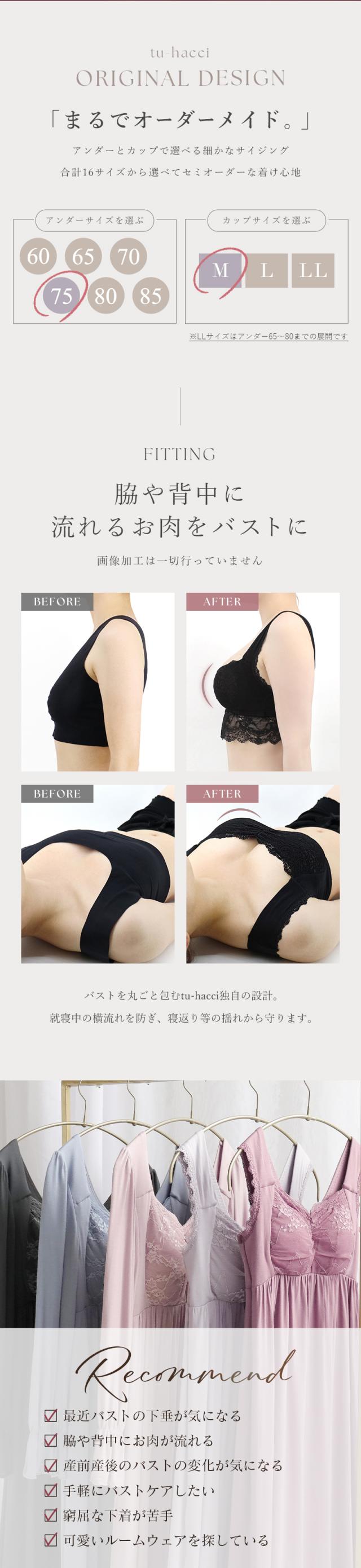 〜tu-hacciのナイトブラシリーズ「ラクシアスリープ」〜 バストの横流れを予防し、理想の位置にキープ。ノンワイヤーでもホールド力が高く、寝ている間も快適でソフトな着け心地にこだわったナイトブラ。 そのtu-hacciの人気No.1ナイトブラ「ラクシア」をそのまま内蔵したルームウェアも。 ■こんな方におすすめ ・バストの下垂が気になる ・脇や背中にお肉が流れる ・産前産後のバストの変化が気になる ・バストケアをしたい ・窮屈な下着が苦手 \産前産後にも/ 縦横に伸縮するので、カップを下げての授乳も可能。 マタニティ期のデリケートなお肌にも。 マタニティフォトの衣装や出産祝いにも ■特徴 ・アンダーとカップのサイズをそれぞれ選べて、オーダーメイドなフィット感 ・カップ横にパワーネットを設置。バストの横流れを防ぎ、寝返り等の揺れから守ります ・バストを「まるごと」包み込むハンド型パッド採用 ・幅広ストラップで肩への負担を軽減。ラクな着け心地 ・工場との直接生産だからこそ実現できた価格とクオリティー |