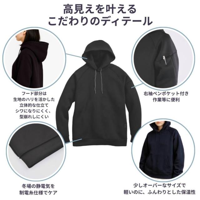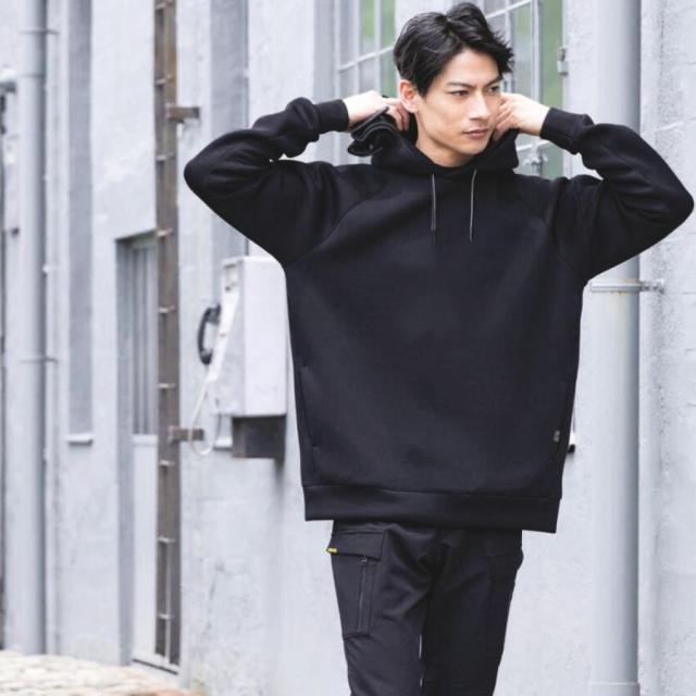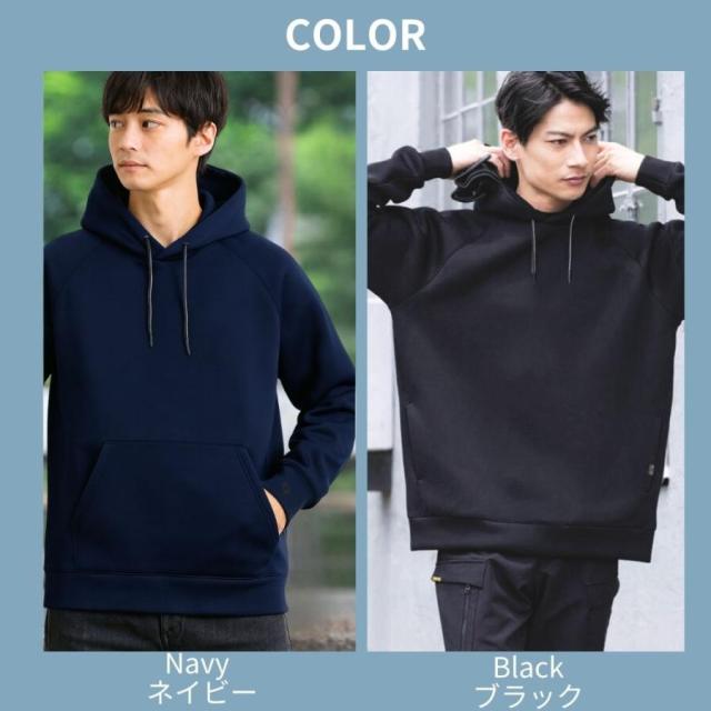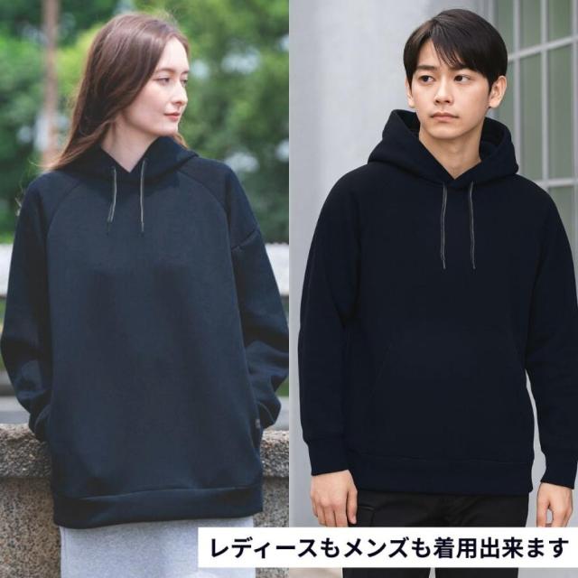 【特徴】軽くて暖かく、シンプルでありながら高見えするデザインが魅力のパーカーです。生地には4WAYストレッチ素材を採用しているため、体の動きに合わせて自在に伸縮し、日常の動作から作業やスポーツまで快適に着用いただけます。厚みがありながら驚くほど軽く、ふんわりとした空気を含むような保温性で、秋口から春先まで長いシーズン活躍します。フード部分は生地のハリを活かした立体的な仕立てで、かぶらなくても美しい形を保ち、顔まわりを自然にカバーしてすっきりとした印象を演出します。後ろ姿まで整ったシルエットを保つため、大人のカジュアルスタイルにもぴったり。少しゆとりのあるサイズ感はリラックスした着心地を生み出しつつ、だらしなく見えない絶妙なバランスです。また、冬場に気になる静電気を軽減する制電ケア仕様を取り入れており、乾燥する季節でも快適。右袖には便利なペンポケットが付いているため、仕事着としても役立ちます。シワになりにくく型崩れしにくい素材なので、お手入れも簡単。普段使いから作業着、ちょっとした外出や旅行まで幅広く使える万能な一枚です。