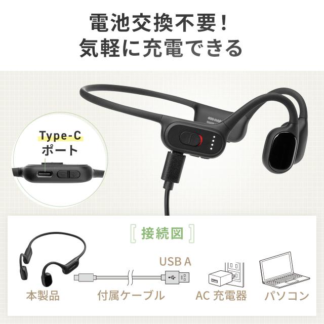 ●どこでも充電しやすいUSB充電式。骨伝導式にありがちな商品独自の充電端子ではなく、お手持ちのType-Cケーブルでも充電できます。