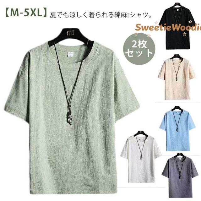 夏 【2枚セット】綿麻tシャツ 半袖 リネンTシャツ コットン メンズ tシャツ 麻 リネン 大きいサイズ トップス クルーネック ティーシャツ 体型