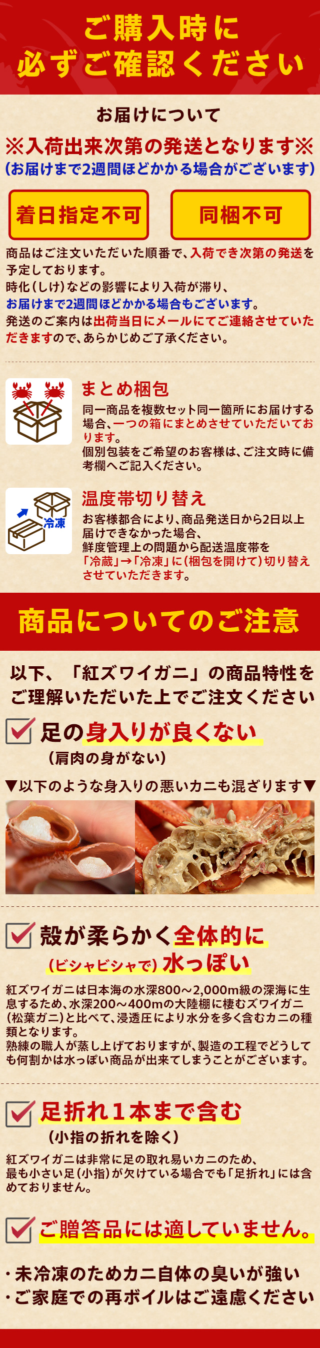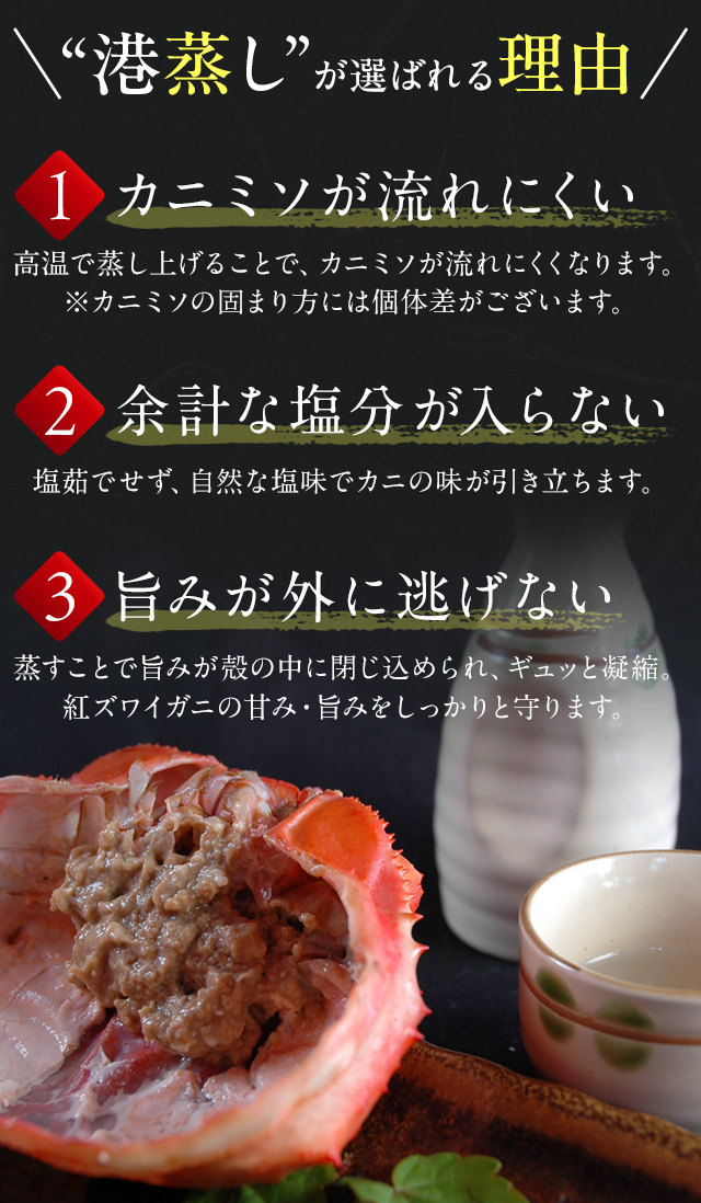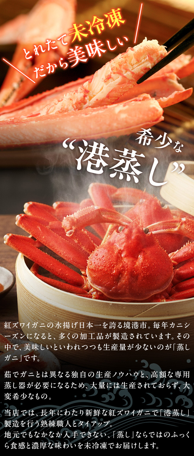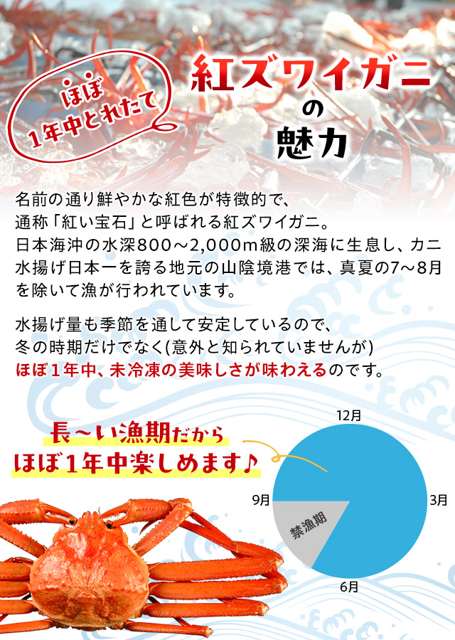 朝どれ新鮮「境港産紅ずわいがに」をカニの本場から産地直送。蒸したて未冷凍ならではの凝縮された旨味と甘みをご自宅でご堪能いただけます。禁漁期の7〜8月を除き、ほぼ一年中楽しめるのも境港産紅ずわいがにの魅力です。