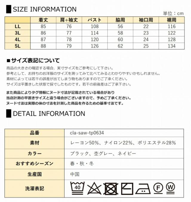 5L:着丈88 肩+袖丈79 バスト126 脇周62 袖口周25 裾周134