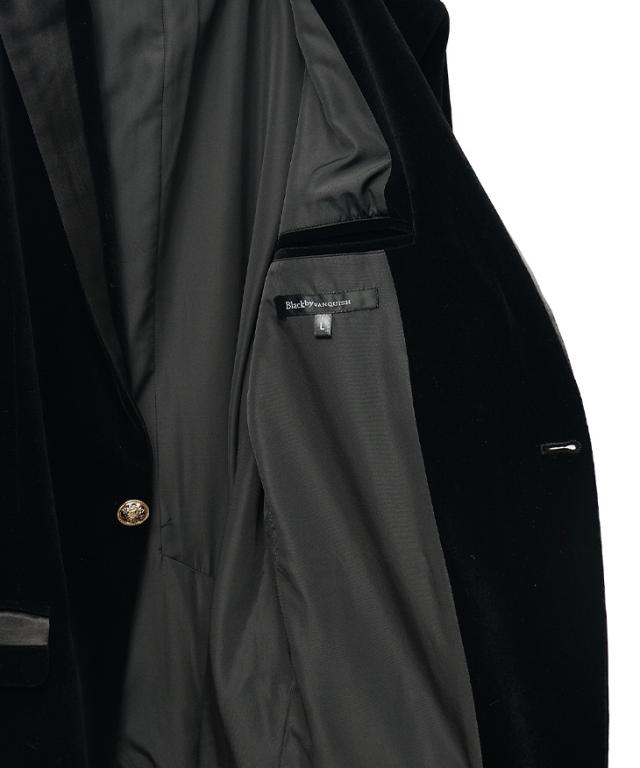 Black by VANQUISH 『ベロアテーラードジャケット』【1Bベロアテーラードジャケット】■Design/デザイン深みのある光沢としなやかな肌触りが際立つジャケット。ブラックのベロアが放つ艶やかな輝きは、スタイルに高級感と上品さを与え、着る人の雰囲気を一段と格上げする。テーラードならではのシャープなラインとシングルボタンのシンプルなデザインは、フォーマルからカジュアルまで幅広いシーンに対応。Tシャツの上にさらりと羽織れば大人の余裕を感じさせ、シャツやニットと合わせれば一層洗練された印象を演出。柔らかな生地感は着心地の良さも兼ね備え、秋冬のアウターとして最適。大人の男性にふさわしい、エレガントでラグジュアリーな一着をお試しあれ。