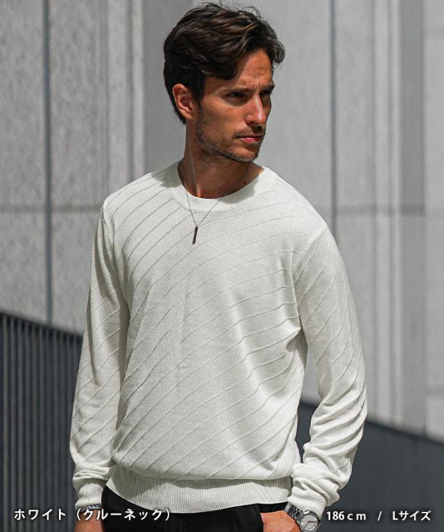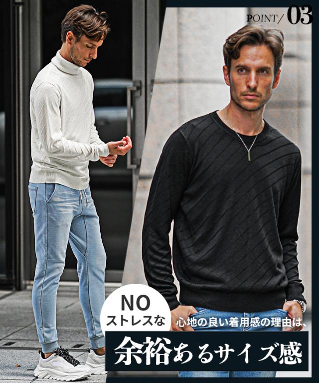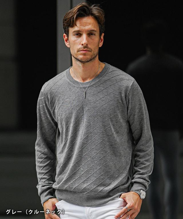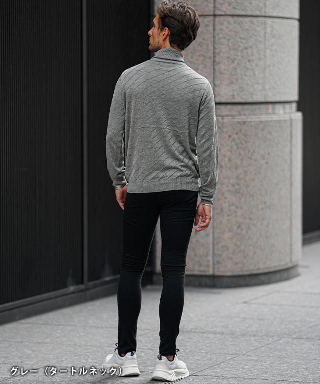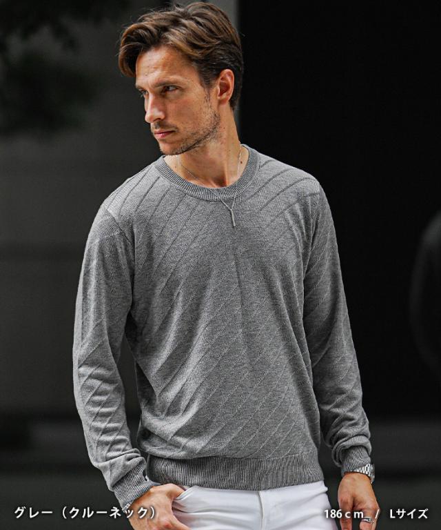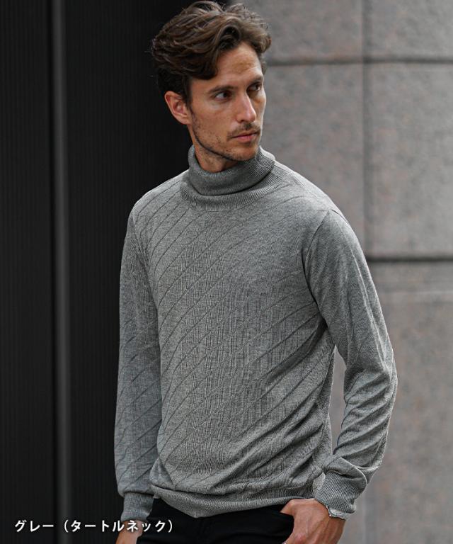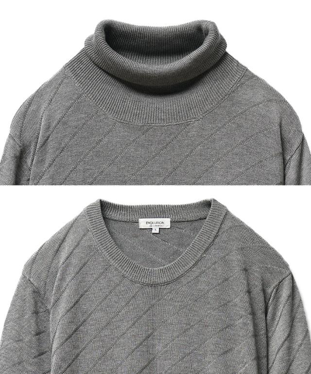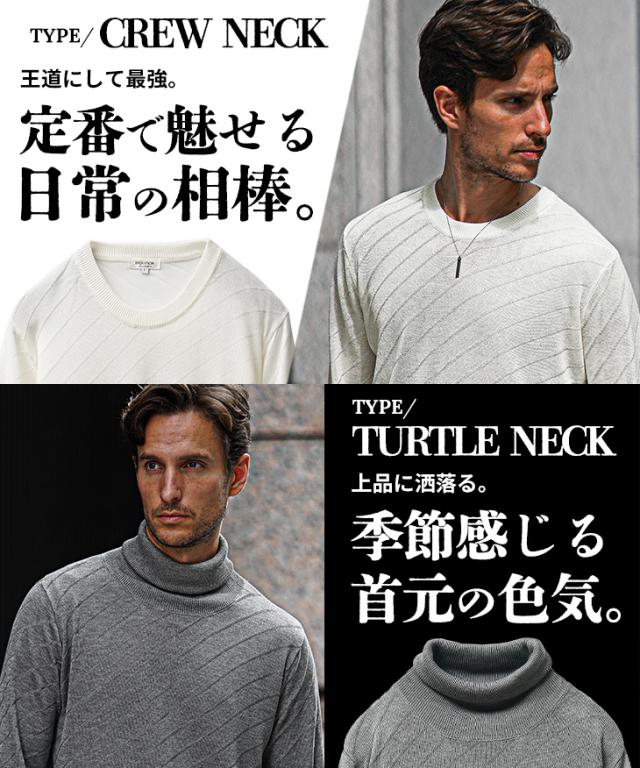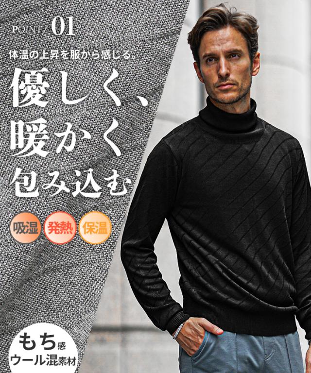 華麗にコーデを彩る2タイプ『発熱・保温バイアス柄ニット』【発熱・保温バイアス柄ニット】■Design/デザイン寒い季節に頼れる機能性と上品なデザインを兼ね備えた、バイアス柄ニット。体温を逃がしにくく、着るだけで暖かい心地よさを感じられる一枚。繊細なバイアス柄がシンプルながらも存在感を放ち、大人のメンズトップスとして幅広いシーンで活躍。デザインは定番のクルーネックと、首元までしっかり守ってくれるタートルネックの2タイプをご用意。カラーは落ち着きのあるグレー、シャープなブラック、清潔感のあるホワイト。どれも合わせやすく、ビジネスからカジュアルまで幅広くコーディネート可能。冬の装いを格上げする、機能性とデザイン性を兼ね備えた長袖ニットトップス。