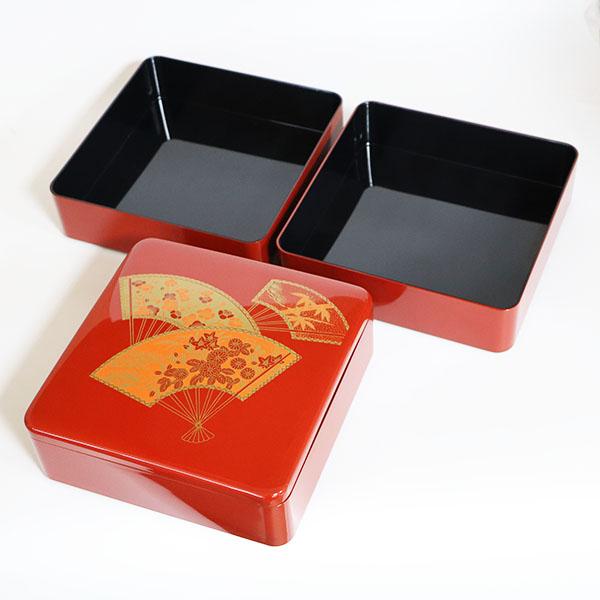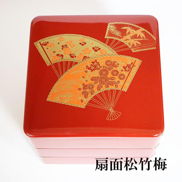 扇面松竹梅が描かれた、縁起の良い三段重箱です。