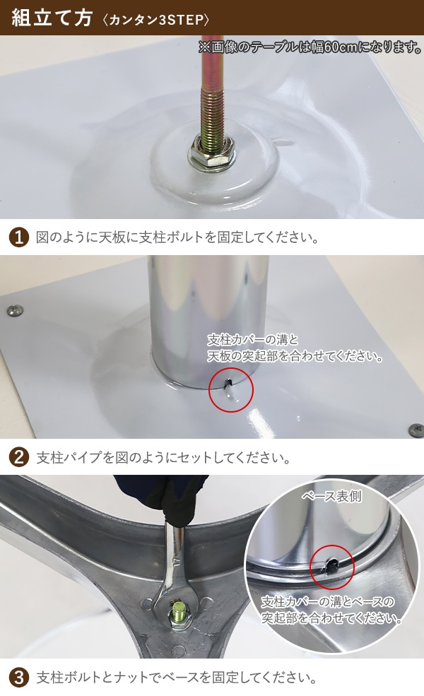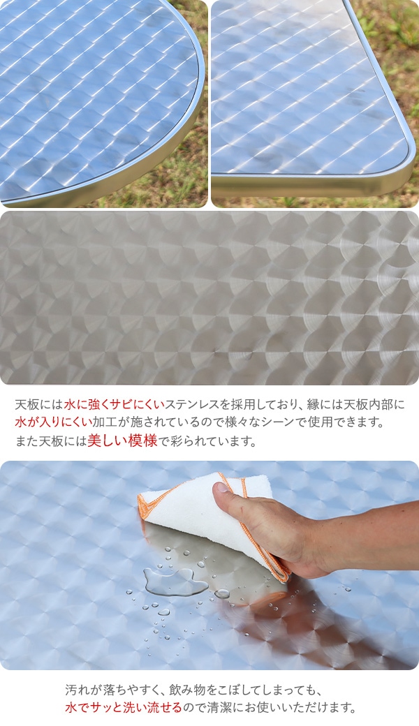 | 材質 | ステンレス+MDF(天板)、アルミ(ベース、支柱パイプ)、プラスチック(アジャスター) |