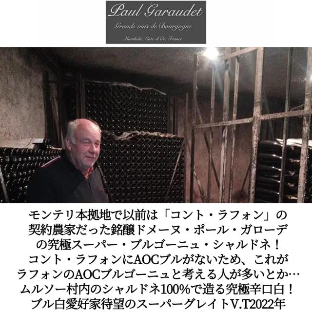 モンテリ本拠地で以前は「コント・ラフォン」の契約農家だった銘醸ドメーヌ・ポール・ガローデ の究極スーパー・ブルゴーニュ・シャルドネ!コント・ラフォンにAOCブルがないため、これがラフォンのAOCブルゴーニュと考える人が多いとか…ムルソー村内のシャルドネ100%で造る究極辛口白!ブル白愛好家待望のスーパーグレイトV.T2022年
