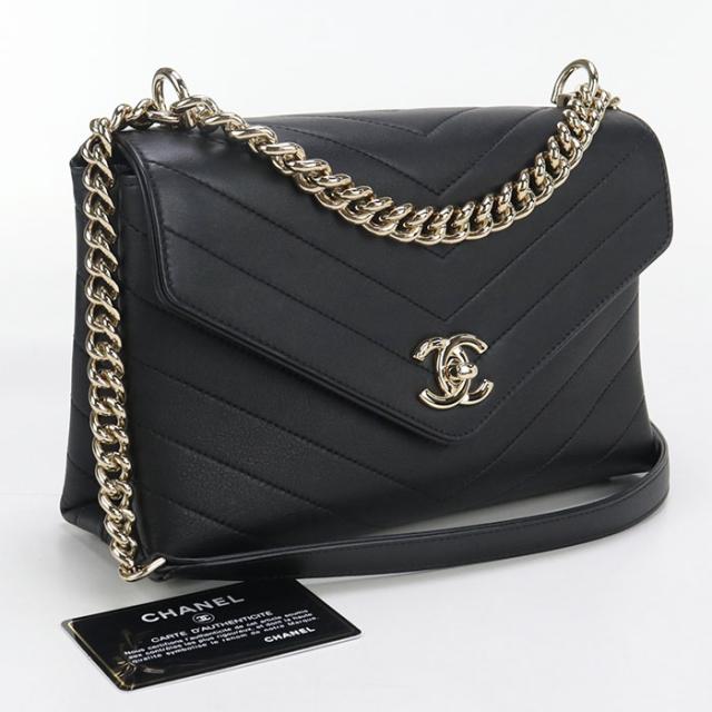 中古良品CHANEL シャネル 斜め掛け ショルダーバッグ チェーン シェブロン レディース ブラック