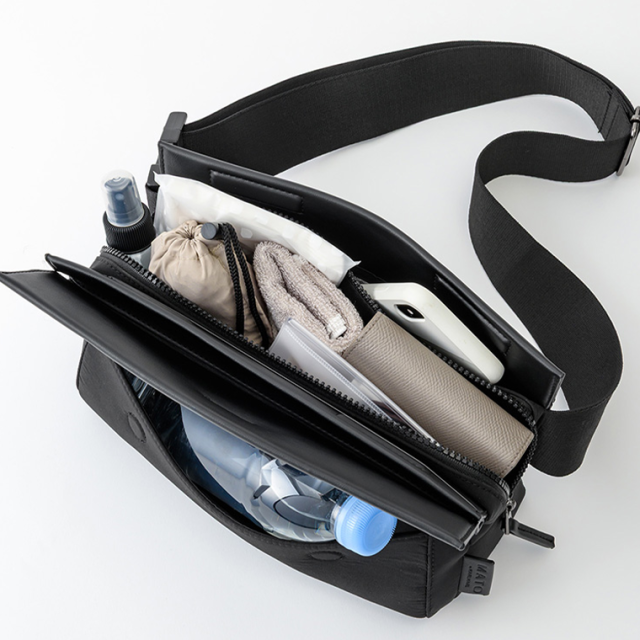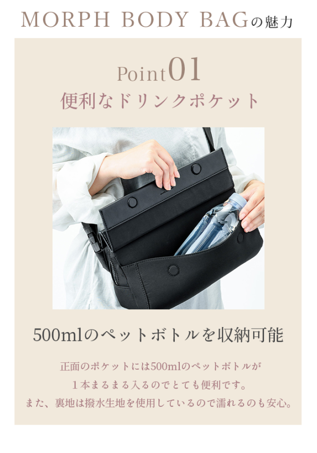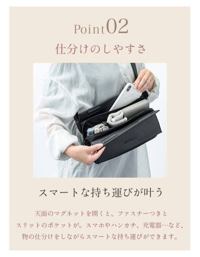 500mlのペットボトルを収納できる正面ポケットの裏地には撥水生地を採用。他の荷物を濡らしてしまうのを防ぎます。天面のマグネットを開くと、ファスナー付きとスリットのポケットが。ワンタッチで取り出したいハンカチやスマートフォンはスリットへ、貴重品はファスナーの中へ入れることで物の仕分けをしながらスマートな持ち運びが叶います。