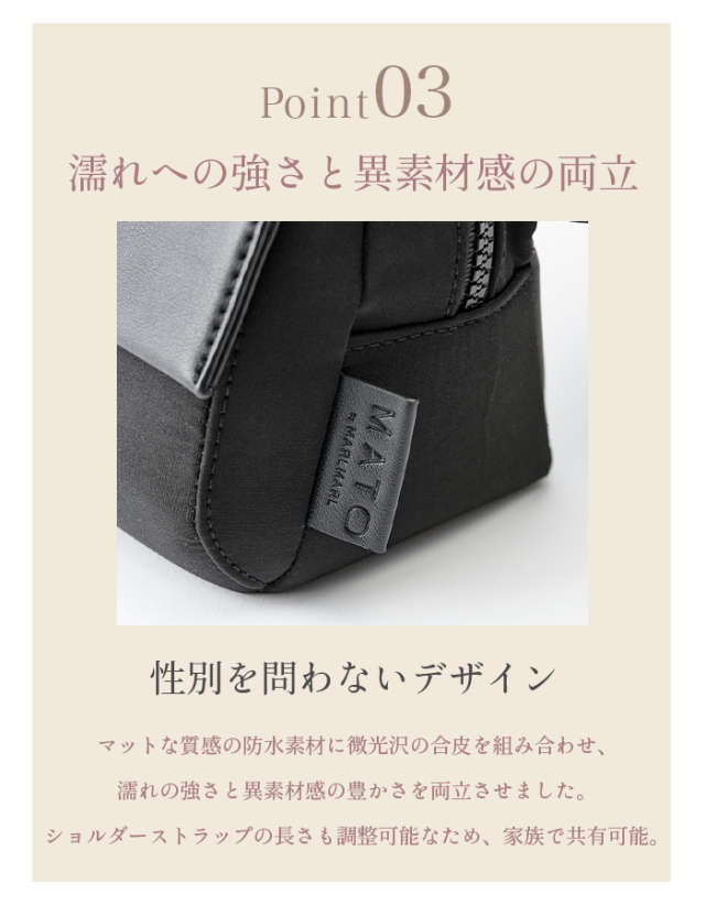 性別を問わないデザインかつ、ショルダーストラップの長さを調整できるため、体格差のある子育てパートナーでも共有できます。子育てシーンに機動力と収納力をプラスするアイテムです。