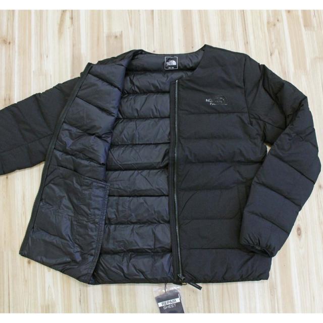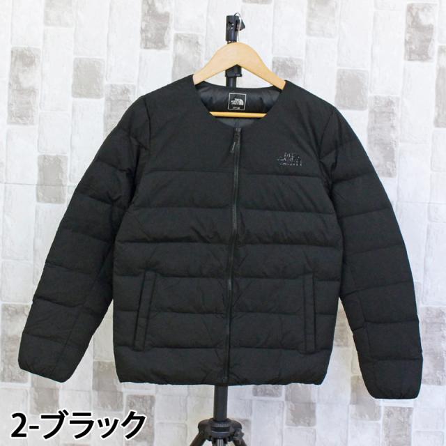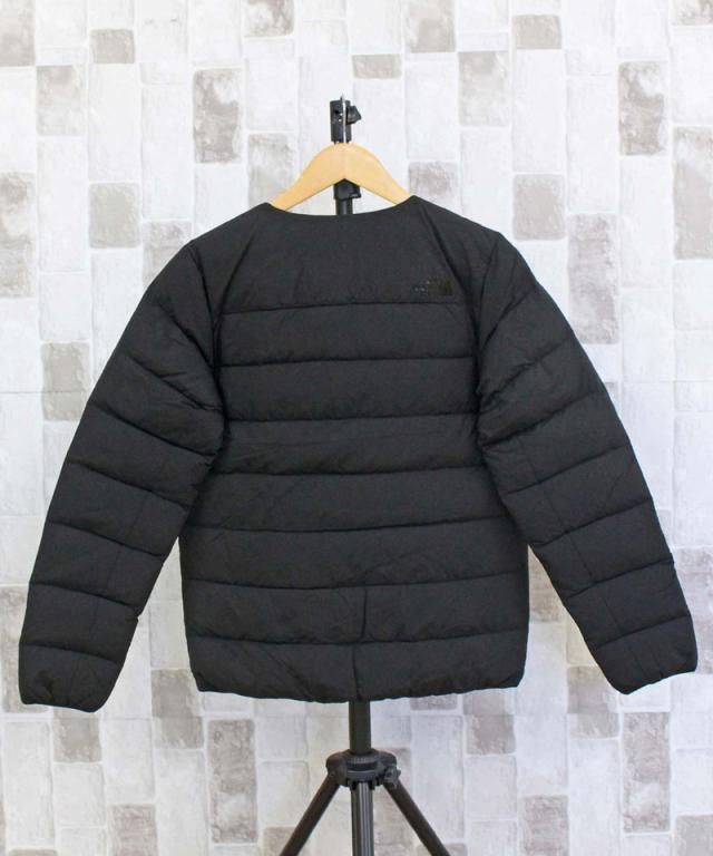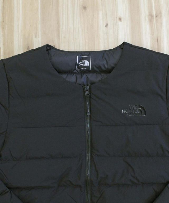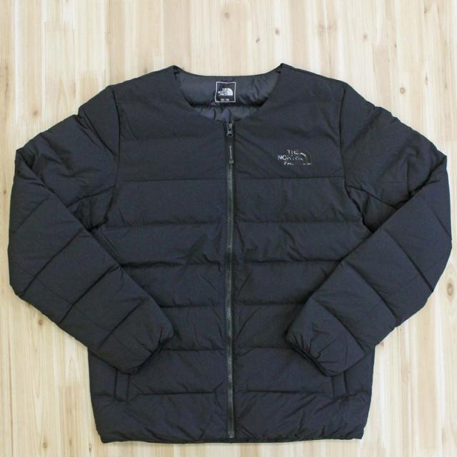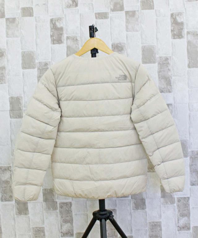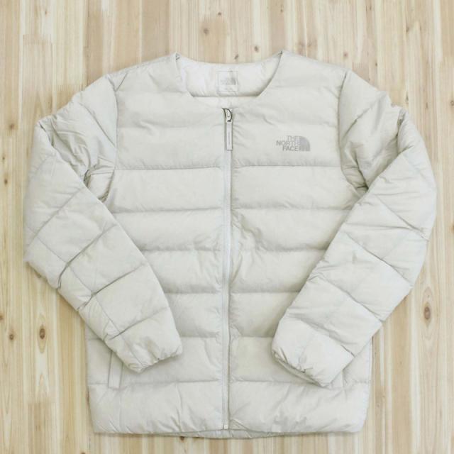 ノーカラー(襟なし)のカーディガンのようなデザインが特徴的なダウンジャケット。