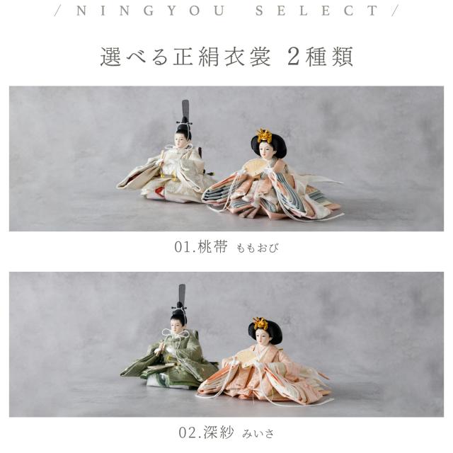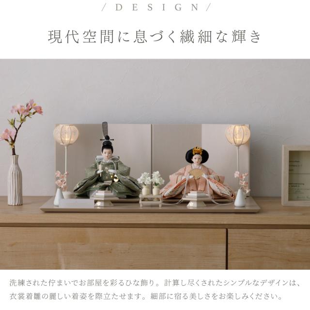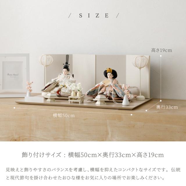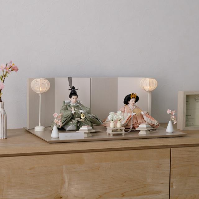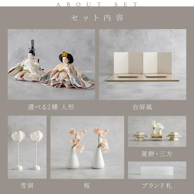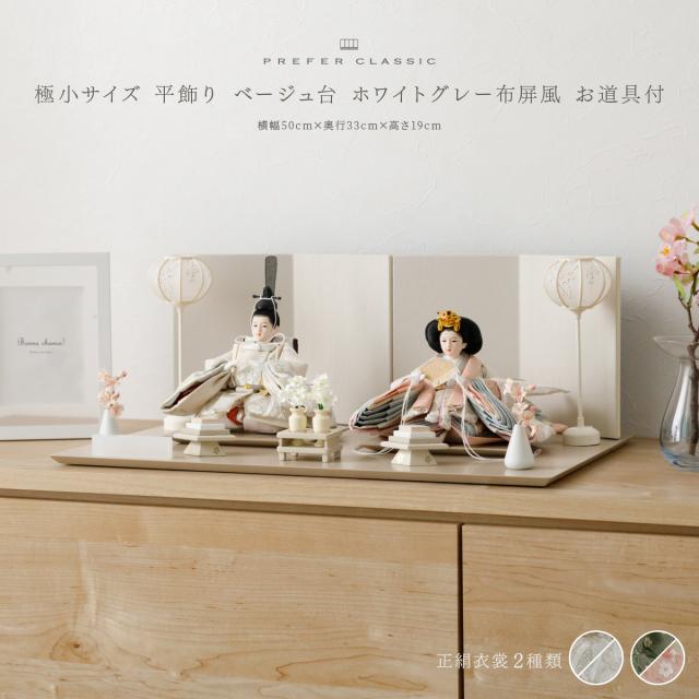 雛人形 高級 PREFER CLASSIC [ベージュ台 ホワイトグレー屏風 平飾り お道具付 人形極小 選べる正絹衣裳2種類] ひな人形 おしゃれ モダン 親王飾り インテリア お雛様 雛 菱餅三方 雪洞 枝桜ピンク 桃帯 深紗 初節句 女の子