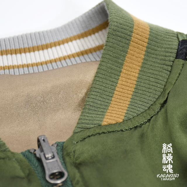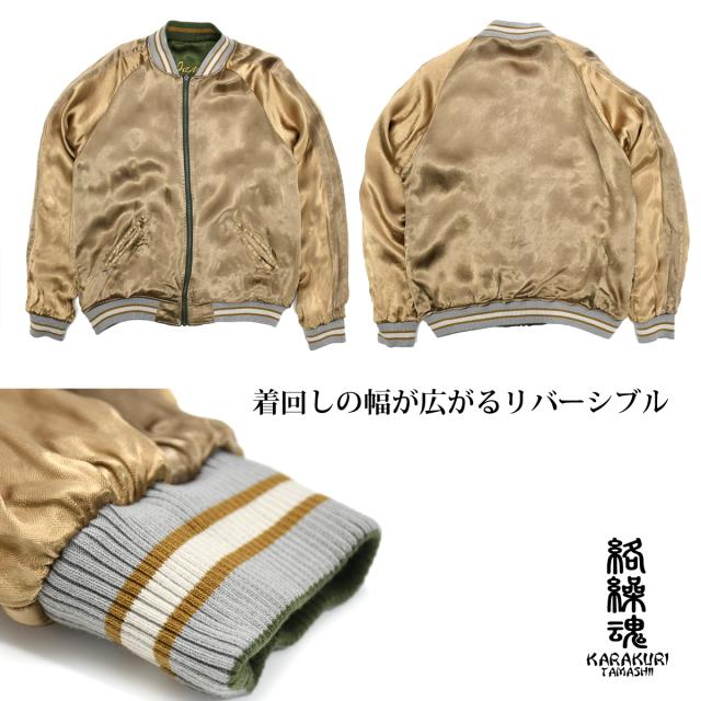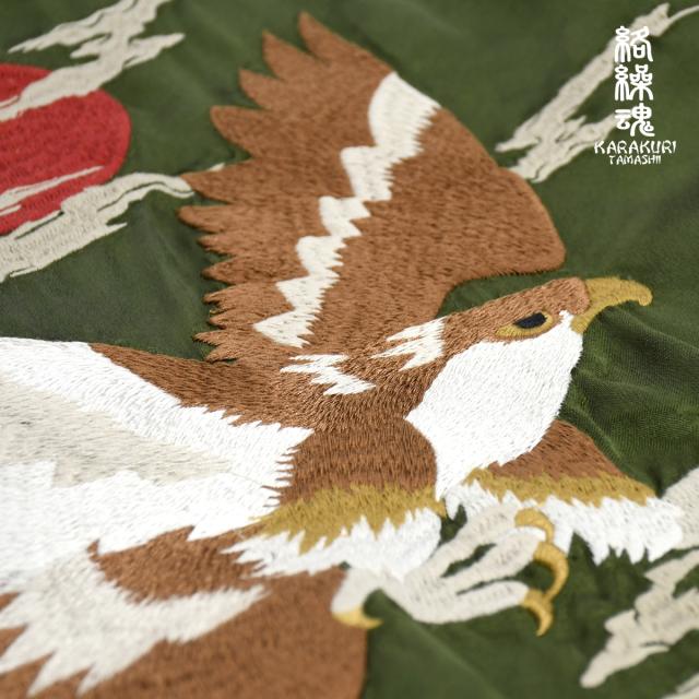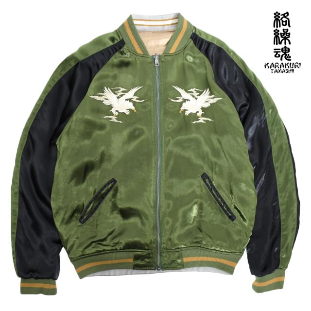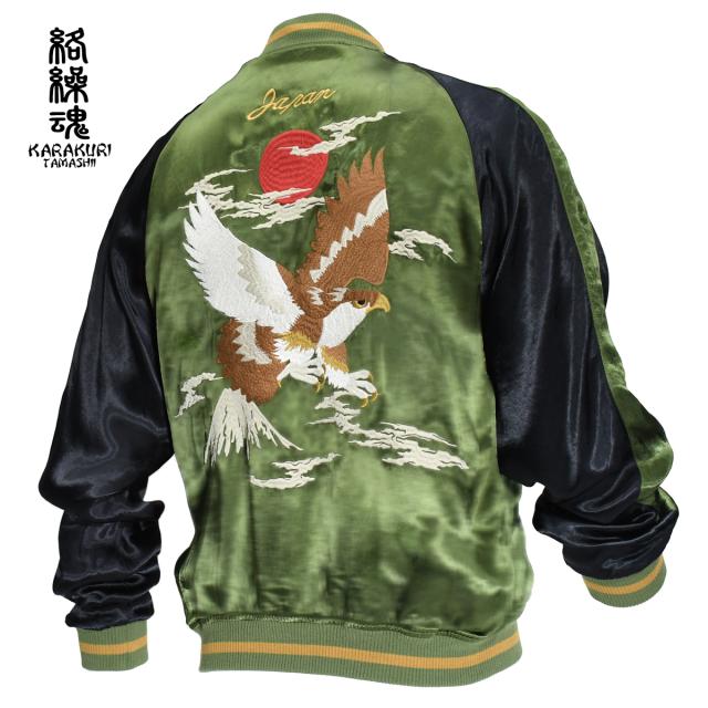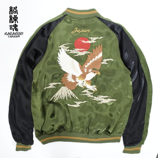 スカジャン 絡繰魂 和柄 刺繍 イーグル 鷹 リバーシブル ユニセックス からくりだましい 横須賀ジャンパー(カーキブラック黒) 253021