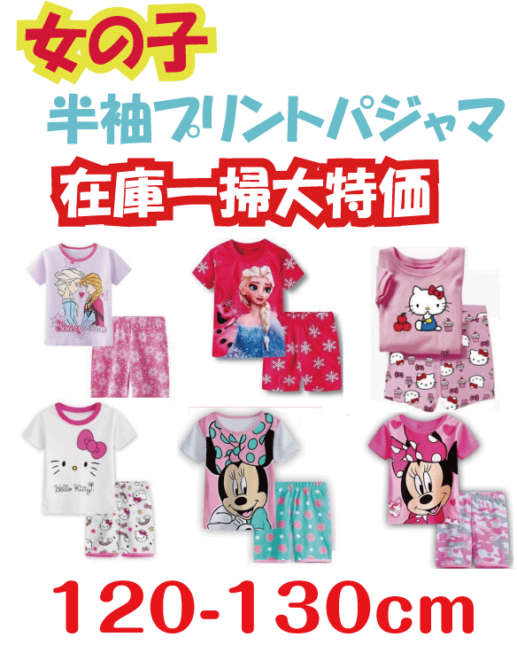 女の子 半袖パジャマ 在庫一掃大特価 ¥1,000 アナと雪の女王 キティちゃん ミニーマウス etc 120-130 綿100% 即日発送!