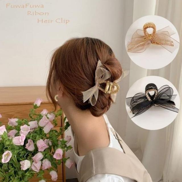 バンスクリップ リボン ヘアクリップ オーガンジー ヘアアクセサリー ふわふわ ゴールド ブラック 髪留め ヘアアレンジ おしゃれ