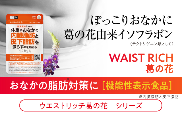 | 届出表示 | 本品には、葛の花由来イソフラボン(テクトリゲニン類として)が含まれます。 葛の花由来イソフラボン(テクトリゲニン類として)には、肥満気味な方の、体重やお腹の脂肪(内臓脂肪と皮下脂肪)やウエスト周囲径を減らすのを助ける機能があることが報告されています。 |