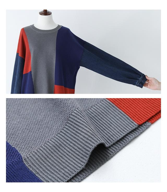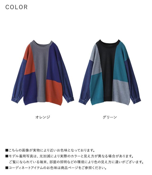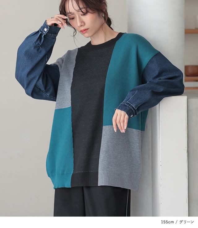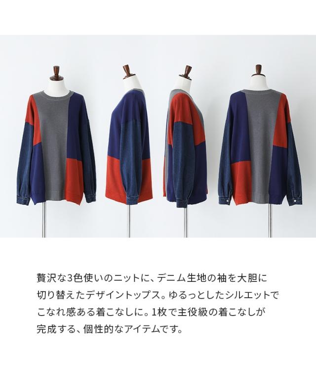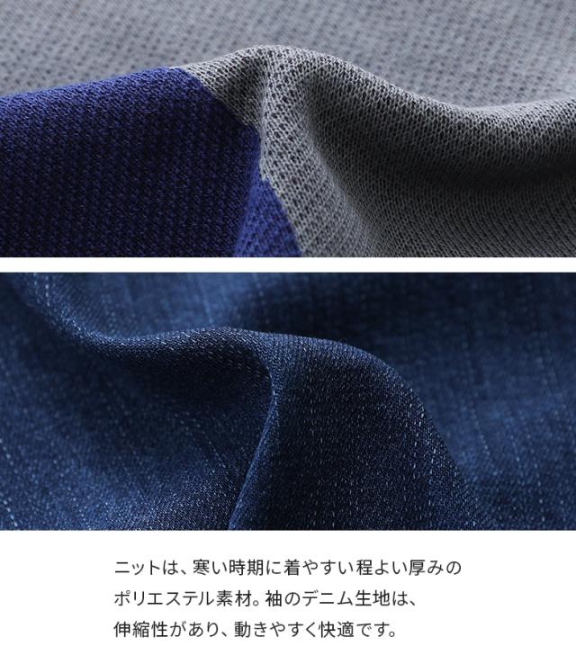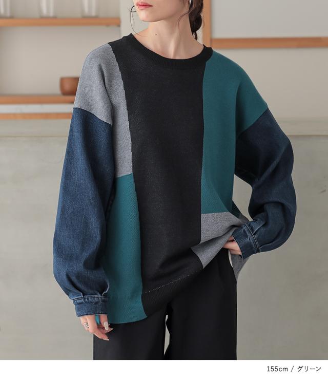 <冬新作>『デニム袖配色ニット』【メール便不可】【30】[ニット 長袖 レディース トップス セーター デニム袖 切り替え 配色 ジャカード ジャガード クルーネック ゆったり 秋 冬]