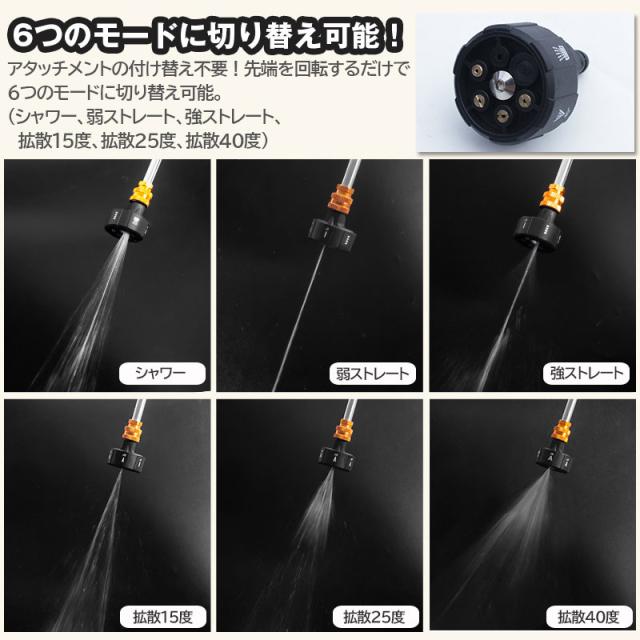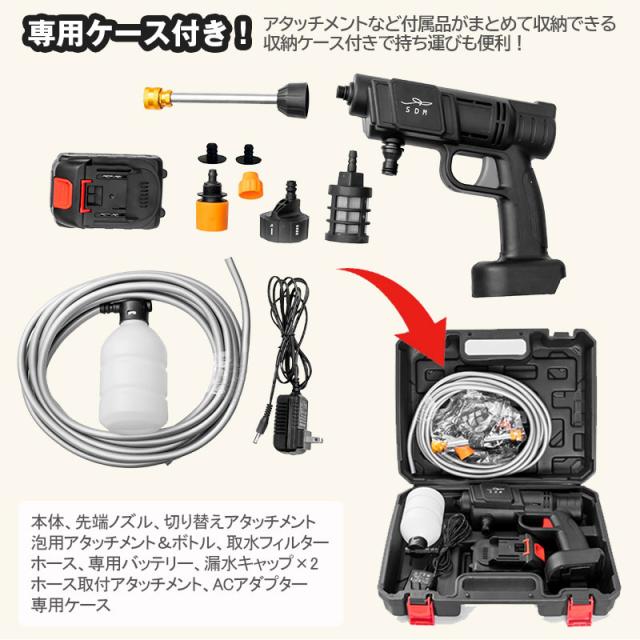【セット内容】本体、充電用ACアダプター、先端ノズル、切り替えアタッチメント、泡用アタッチメント&ボトル、取水フィルター、ホース取付アタッチメント、専用バッテリー、専用ホース5m、専用ケース、漏水キャップ×2