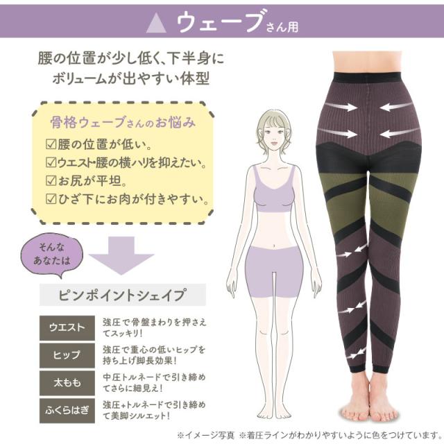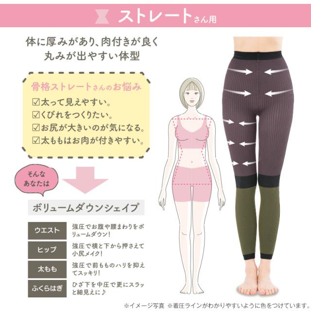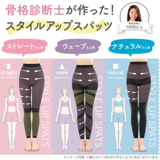 | 商品説明 | はいてキレイに♪骨格タイプに合わせて美シルエット!骨格診断士が作ったスタイルアップスパッツ。骨格にフィットして、毎日キレイ。ストレート・ウェーブ・ナチュラル、3つの骨格タイプ別に選べる理想の1枚。自分の骨格タイプに合わせて選べるスタイルアップスパッツは、それぞれの体型の悩みにアプローチする専用設計で、より自然に、より美しくスタイルアップ。はくだけで引き締めてメリハリのあるラインへ。骨格タイプに合わせた強弱着圧で、気になる凹凸をピンポイントで引き締め、スッキリとしたボディラインへ。ストレートタイプさんにはボリュームダウンシェイプ。体に厚みがあり肉付きが良くまるみが出やすいストレートさんは、お腹・お尻・太ももを集中シェイプですっきりとしたラインシルエットに。ウェーブタイプさんにはピンポイントシェイプ。腰の位置が低めで下半身にボリュームが出やすいウェーブさんは、ウエストの広がりを抑え、ふくらはぎ〜太ももまでスパイラル着圧で脚全体を引き締めて美脚シルエットに。ナチュラルタイプさんにはメリハリシェイプ。骨格がしっかりして直線的になりやすいナチュラルさんは、お腹まわりをギュッと引き締めてくびれメイク。丸みのあるヒップラインを作って全体的にやわらかさをプラス。長時間はいても快適設計。しっかりとした着圧がありながらはきやすいストレッチ性で、薄手だからボトムスの下にはいても響きにくく、デイリー使いにもピッタリ。 |