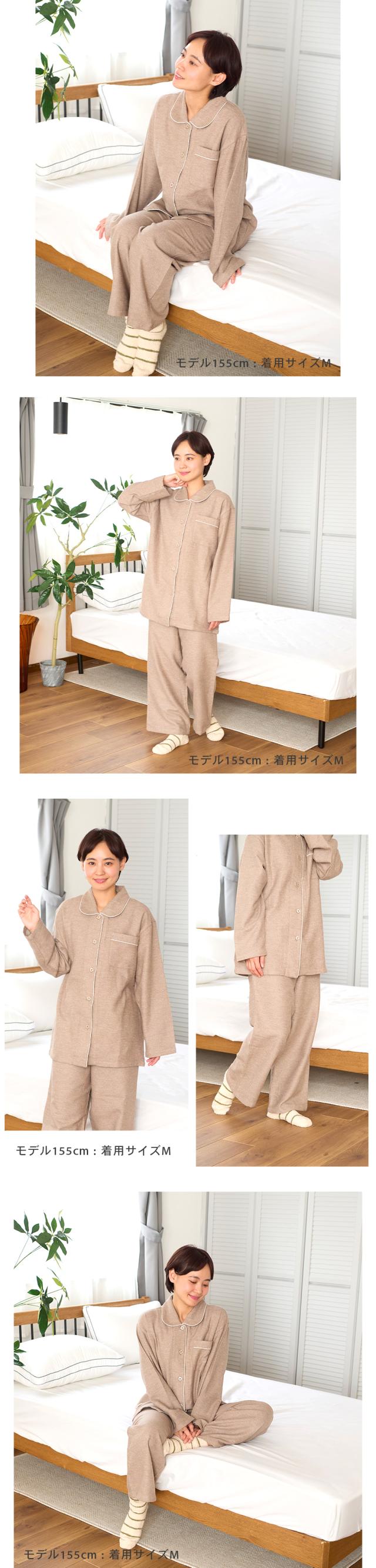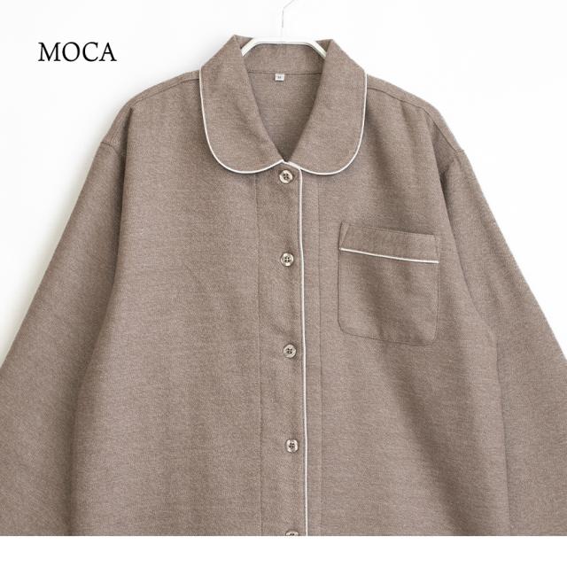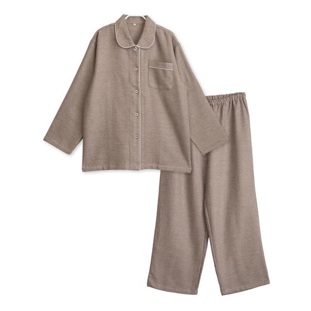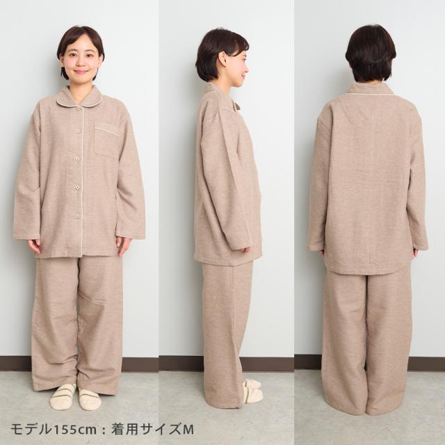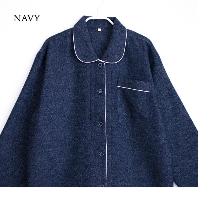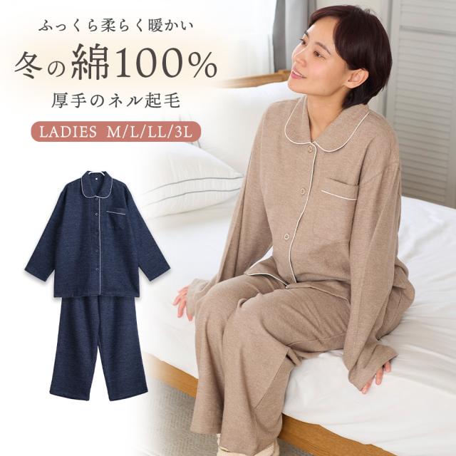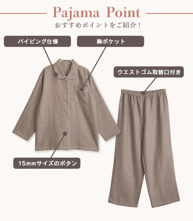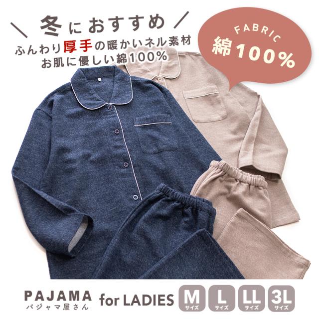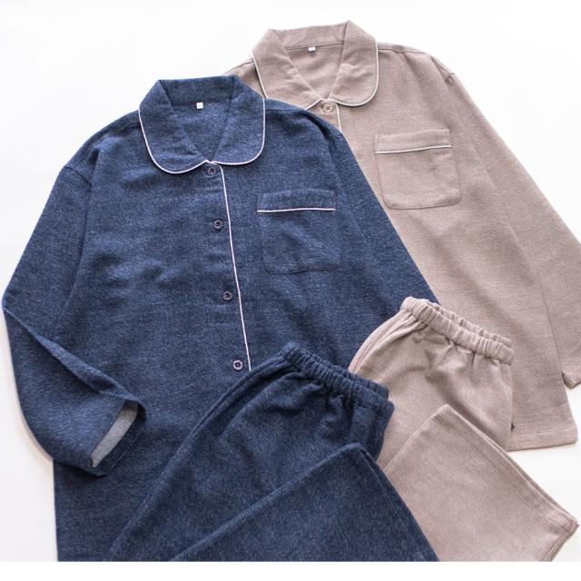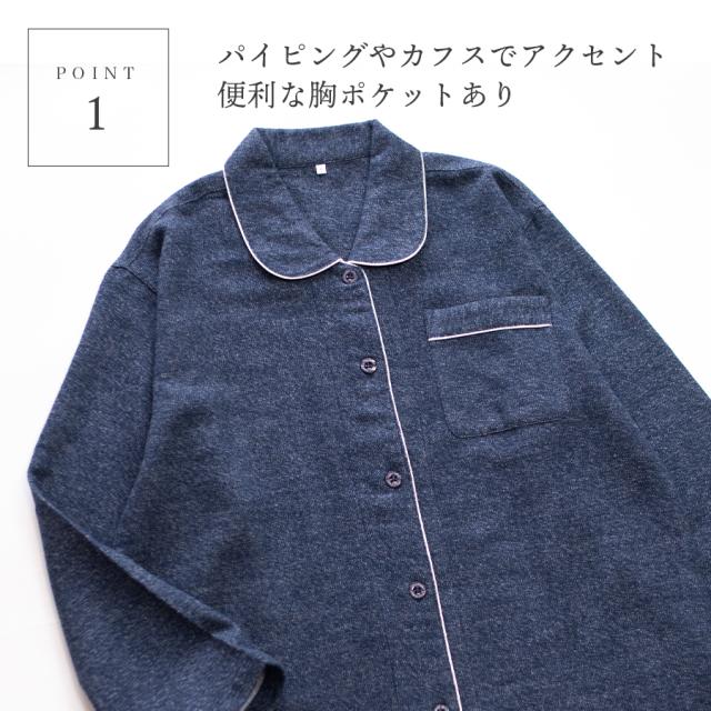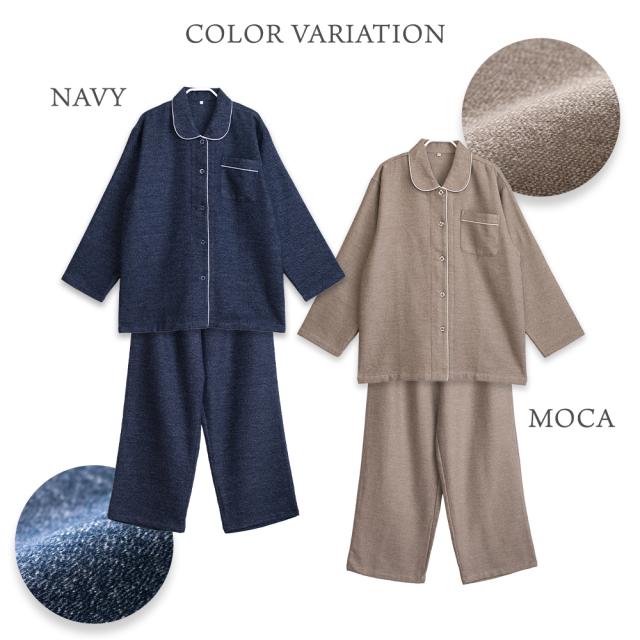 パジャマ レディース 綿100% 長袖 秋 冬 前開き ボタン 二重構造 ふっくら暖かく柔らかい ネル起毛 先染め 杢調 無地 ネイビー モカ M L LL 3L 親子 おそろい リンクコーデ 家族 ギフト プレゼント 敬老の日 母の日 61985
