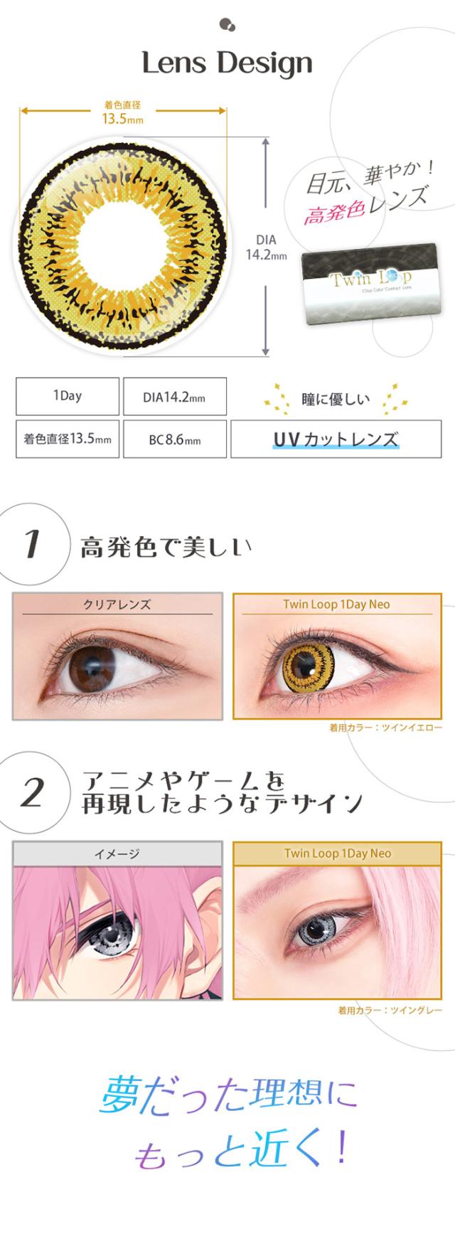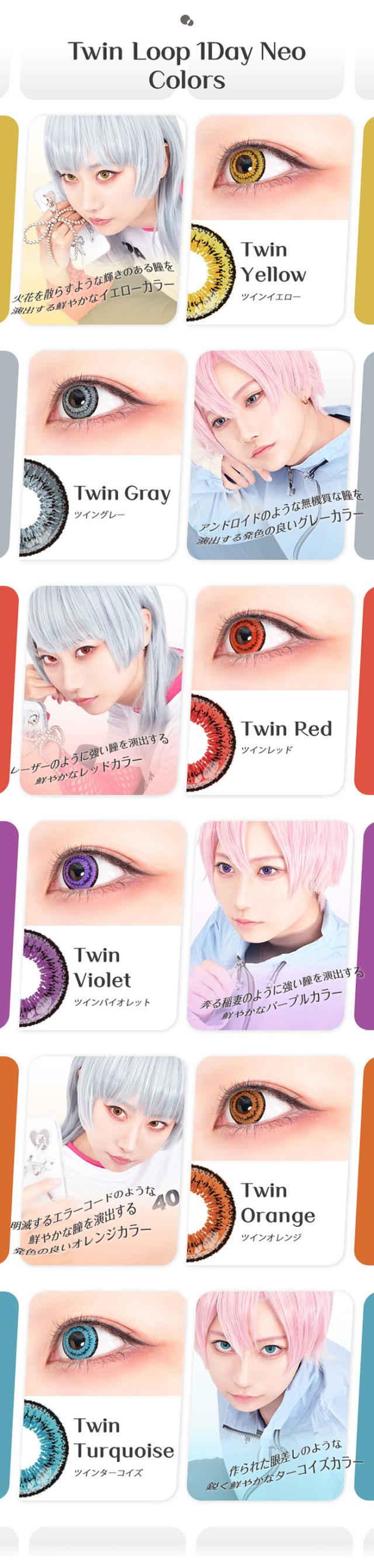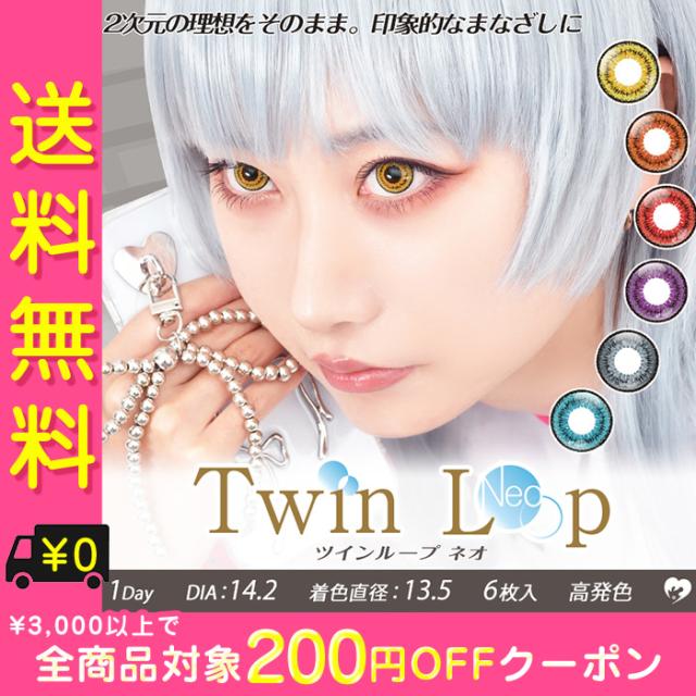 カラコン ワンデー 度あり ツインループネオ Twin Loop Neo 1箱6枚入り DIA14.2mm BC8.6 ハロウィン コスプレ 高発色 仮装 コスプレイヤー レッド パープル ブルーイエロー 赤 青 黄色 紫