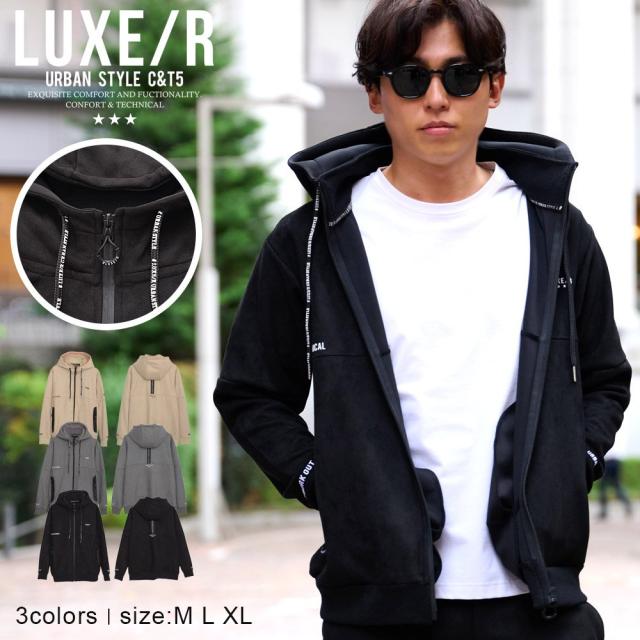 パーカー メンズ ジップパーカー ブランド アウター ジップアップ トップス フェイクスウェード スエード ロゴ グレー ブラック 止水ジップ ポケット スポーツ 黒 セットアップ可 LUXE R ラグジュ 大人 M L XL 20代 30代 40代 50代 秋 冬 秋冬 ファッション [46134]
