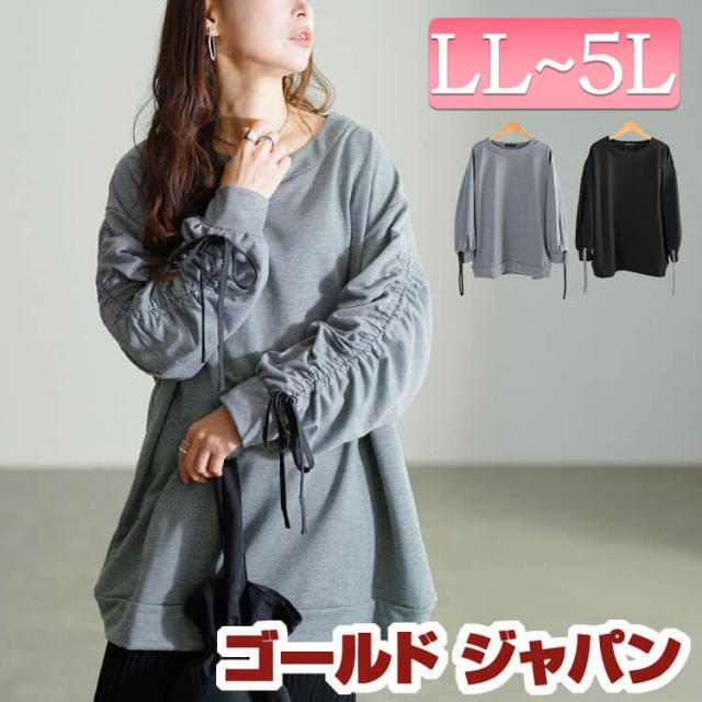 冬新作 大きいサイズ レディース トップス カットソー ドロストスリーブプルオーバー プルオーバー 長袖 クルーネック ドロスト ギャザー リボン 袖コンシャス ボリュームスリーブ ストレッチ ゆったり 秋服 冬 春服 LL 2L 3L 4L 5L ブラック 黒 杢グレー ゴールドジャパン