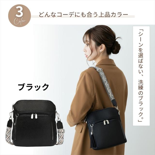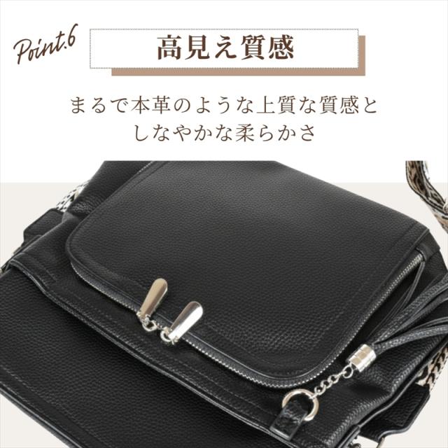 合成皮革のやわらかな質感と上品な見た目で、カジュアルにもきれいめにもマッチの肩掛けバッグ。