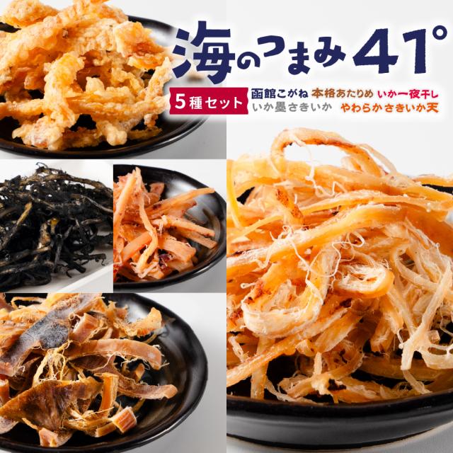 海鮮珍味 海のつまみ41°5種セット(函館こがね・あたりめ・いか墨さきいか・いか一夜・いか天) 個包装 プレゼント ギフト 珍味 セット いか 食べ比べ 高級珍味 焼いか 送料無料 おやつ お取り寄せグルメ ハロウィン お歳暮 冬ギフト
