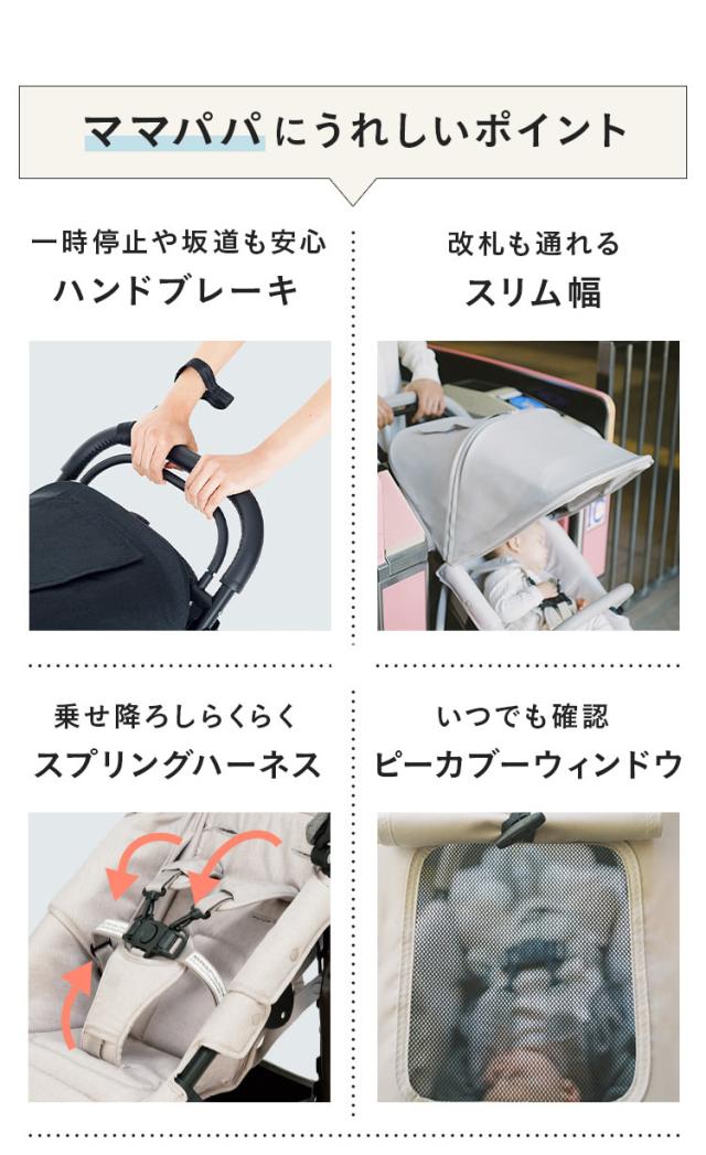 開閉式フロントバー、UVカット率99%以上(UPF50+)、3段階に調整できる深いサンキャノピーやオフロードタイヤ、スタンドロックなど、ワンクラス上の機能をプラスしたCOCO PREMIERフロムバース。