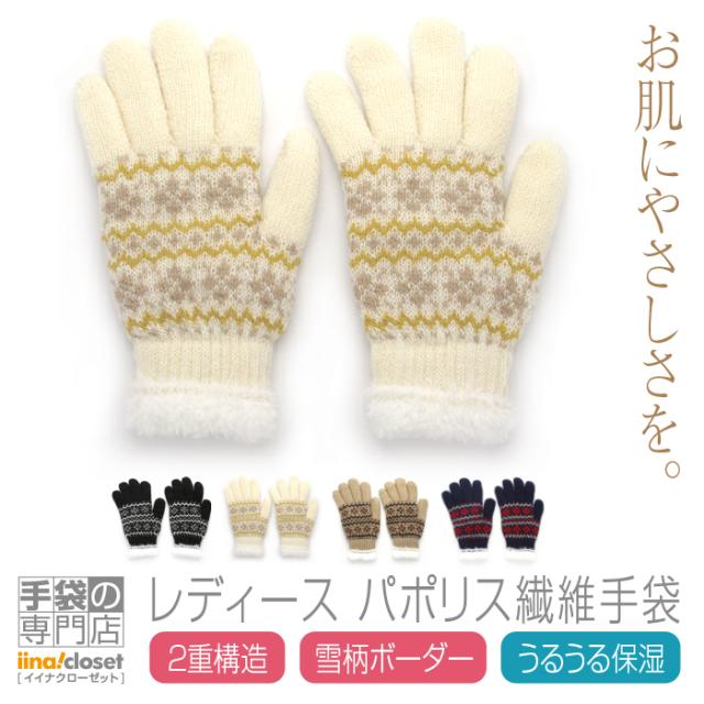 【商品の特長】◆外側はニット生地、内側はモール生地とスクワラン配合繊維の「パポリス®」がお肌を優しく包み込む2重構造♪◆カフス部分はふわふわなショートファー♪◆リブ編みカフスが、手首にしっかりフィット。冷気が内部に侵入しにくい設計♪◆秋冬コーデに取り入れたい人気の「ノルディック柄(雪柄ボーダ ー)」♪◆ブラック、アイボリー、ベージュ、ネイビーの全4色。◆安心安全の日本製。