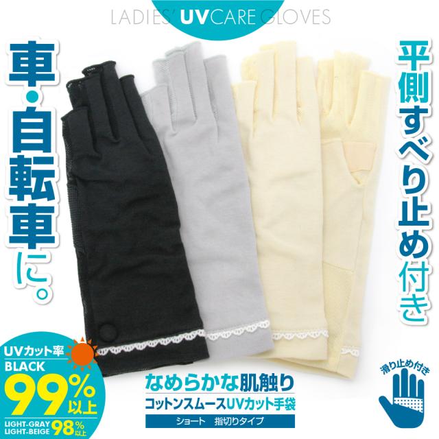 レディース コットンスムースUVカット手袋 ショート丈 指切りタイプ 平側メッシュ&すべり止め付き 全3色