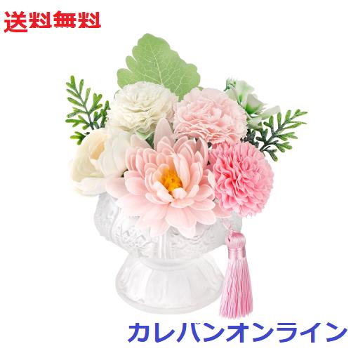 【材質と仕様】花の種類:キク、ヒノキ。神社建築にも使われる聖なる樹木とされ、その葉には「穢れを清める力」があると考えられています。祖先の霊を迎える場を清める役割があります。様々なものが多い仏壇の前でもすぐに飾りやすいサイズとなっております。花器:ガラス製の蓮の花瓶の台座。サイズ:直径13.5cmX高さ19cm(受皿とドームも含みます)。【お供】の札が付き。ガラスの透明感や光の反射が花の美しさを引き立て、目が付くたびに癒やされます。