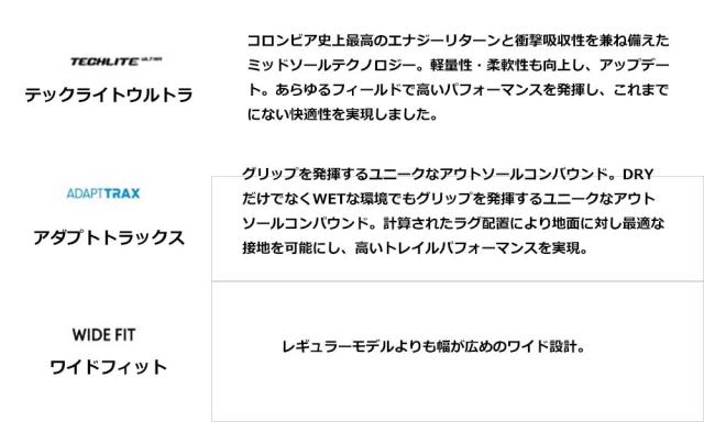 細かなメッシュアッパーが通気性を保ちながら砂や小石の侵入を防ぎ、防水透湿機能「アウトドライ」が雨水をシャットアウトしてムレを逃します。新設計のミッドソールには、軽量で高い反発性と柔軟性を誇る「テックライトウルトラ」を採用。長時間の歩行でも軽快な履き心地を実現。さらに、濡れた路面でも高いグリップ力を発揮する「アダプトトラックス」ソールが、アウトドアから街歩きまで安定した足運びをサポートします。
