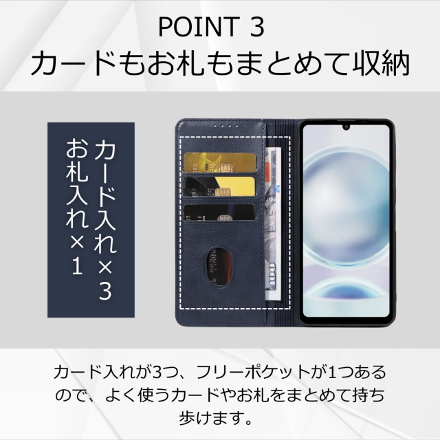収納:カードポケット×3、紙幣やレシートが入るフリーポケット×1