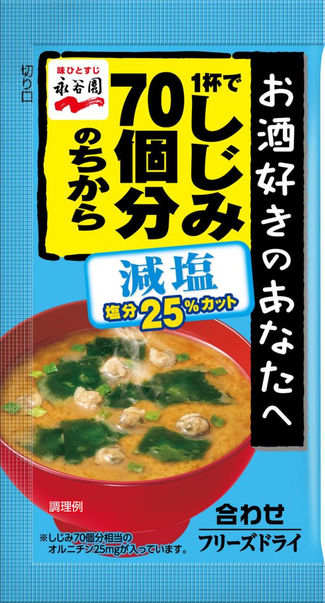 1杯でしじみ70個分相当のオルニチンが摂取できる、フリ ーズドライ製法の粉末みそを使用した即席みそ汁です 当社みそ汁フリ ーズドライ 1杯でしじみ70個分のちからみそ汁と比べ、ナ トリウムを25%カットした減塩タイプです