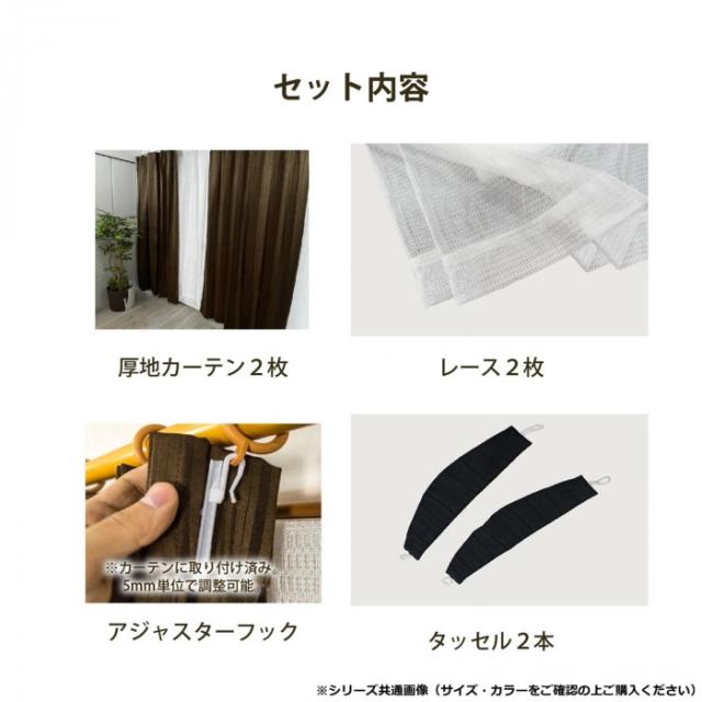 | セット内容 | 厚地カーテン2枚・レースカーテン2枚・アジャスターフック(カーテンに取付け済)・タッセル2本 |