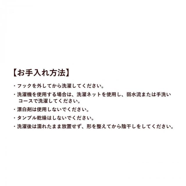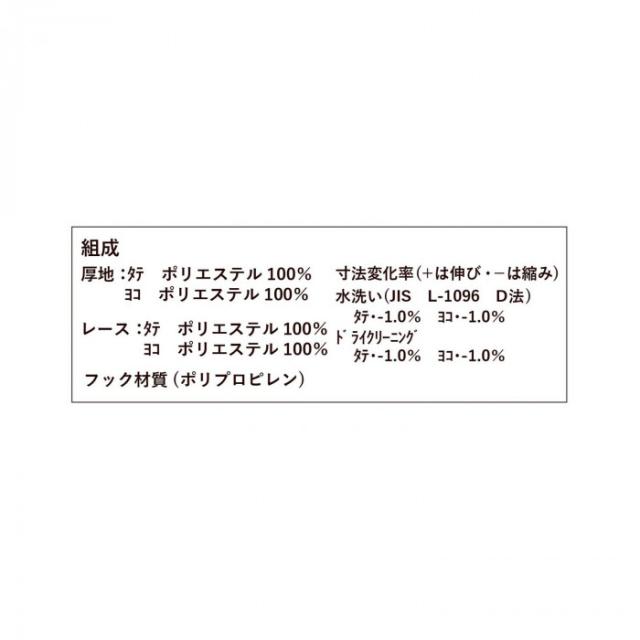 | 素材・材質 | 厚地:タテ/ポリエステル100%、ヨコ/ポリエステル100% レース:タテ/ポリエステル100%、ヨコ/ポリエステル100% フック:ポリプロピレン |