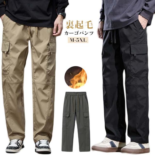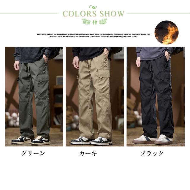 裏起毛 カーゴパンツ メンズ 無地 ストレート ワイドパンツ ズボン ウエストゴム 冬用 防寒パンツ ワークパンツ 動きやすい アメカジ おしゃれ 作業着 アウトドア グリーン カーキ ブラック