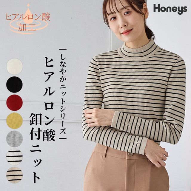 トップス ニット セーター 長袖 しなやかニット ヒアルロン酸加工 ハイネック リブ 無地 ボーダー柄 レディース SALE セール Honeys ハニーズ ヒアルロン酸釦付ニット