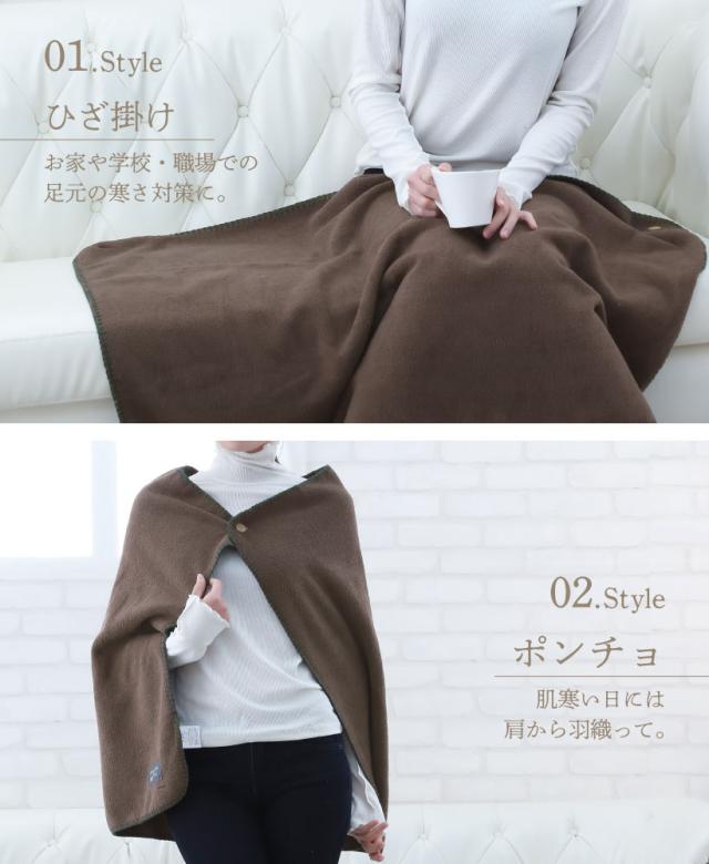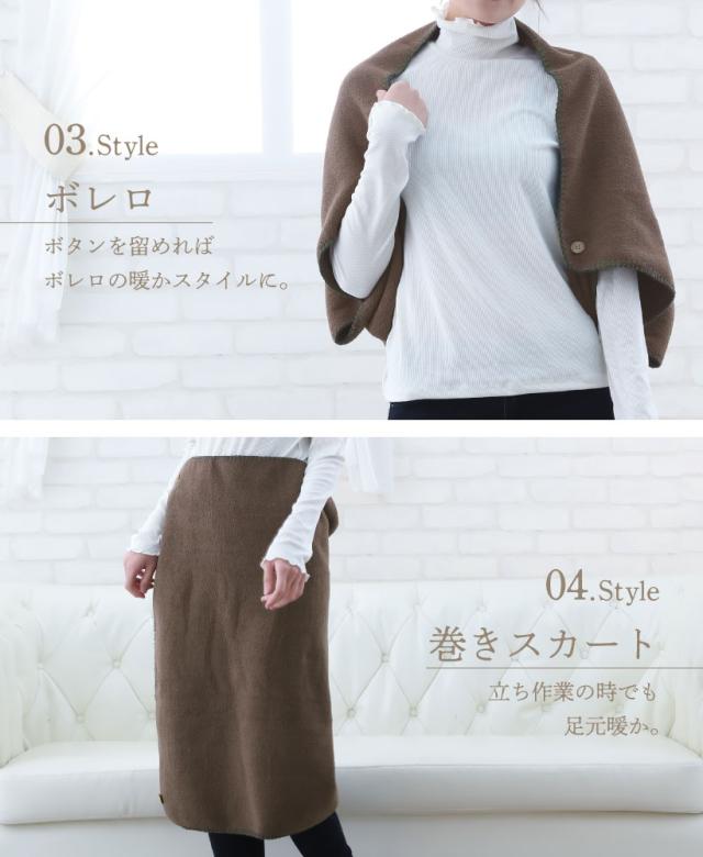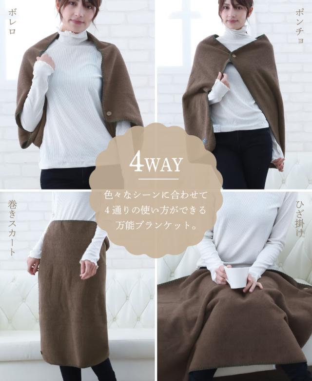 くつろぎ時間から作業時まで幅広く活用できる4wayブランケットです。ひざ掛け・ポンチョ・巻きスカート・ボレロの4通りの使い方が可能!ちょうどいいサイズ感でカラー展開も落ち着いた色なので、お家はもちろん学校や職場にもオススメです◎。