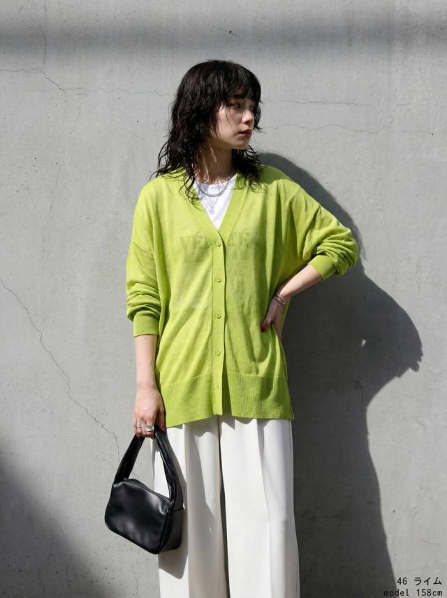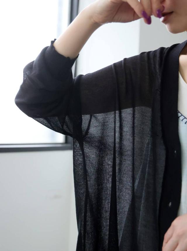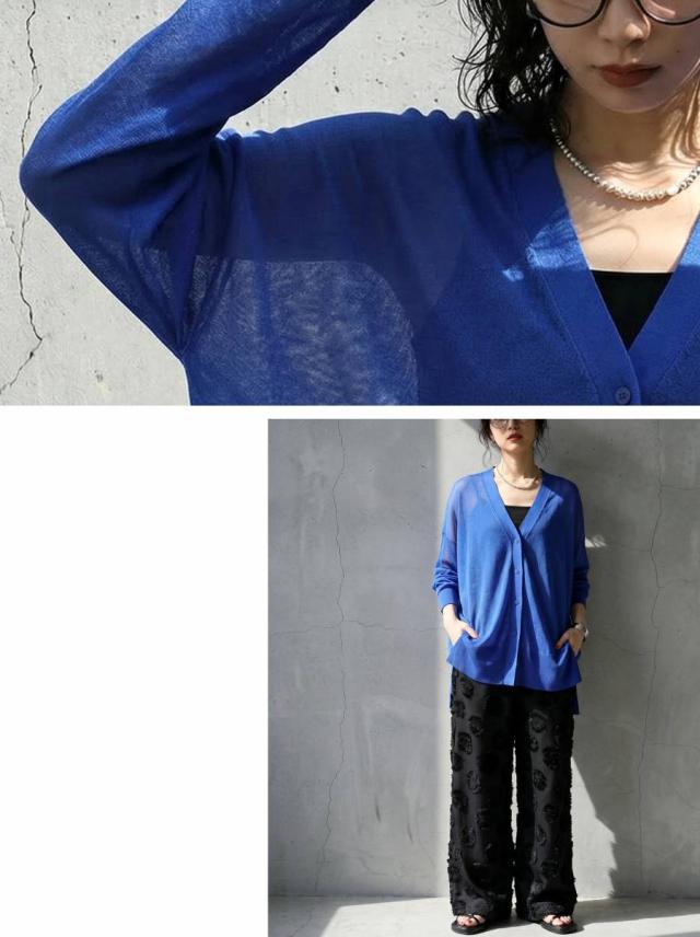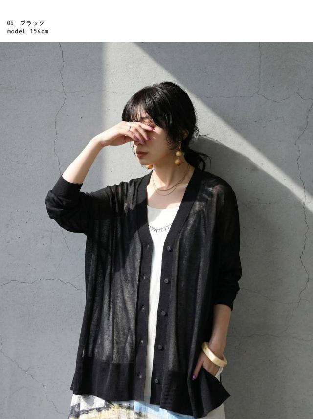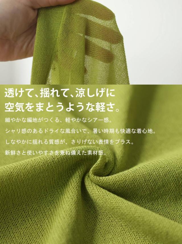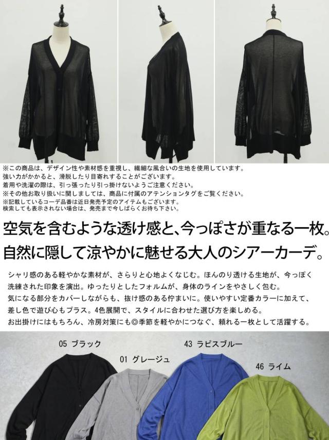 シアー素材を使用した、透け感が魅力のカーディガン(シアーカーディガン・サマーニット・羽織り)です。